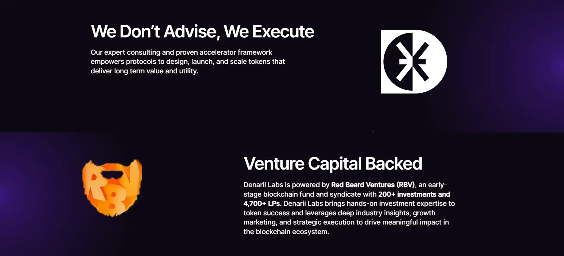 Red Beard Ventures (RBV) is the strategic investment backbone of Denarii Labs. As a leading early-stage blockchain fund with over 200 investments and a vast network of 4,700+ LPs, RBV doesn’t just fund projects—it unlocks investor access, ensures funding readiness, and embeds deep strategic insight into every accelerator cohort. Through RBV, participating teams gain direct exposure to one of the most active investor ecosystems in Web3, enabling stronger fundraising outcomes and long-term alignment with venture capital priorities.