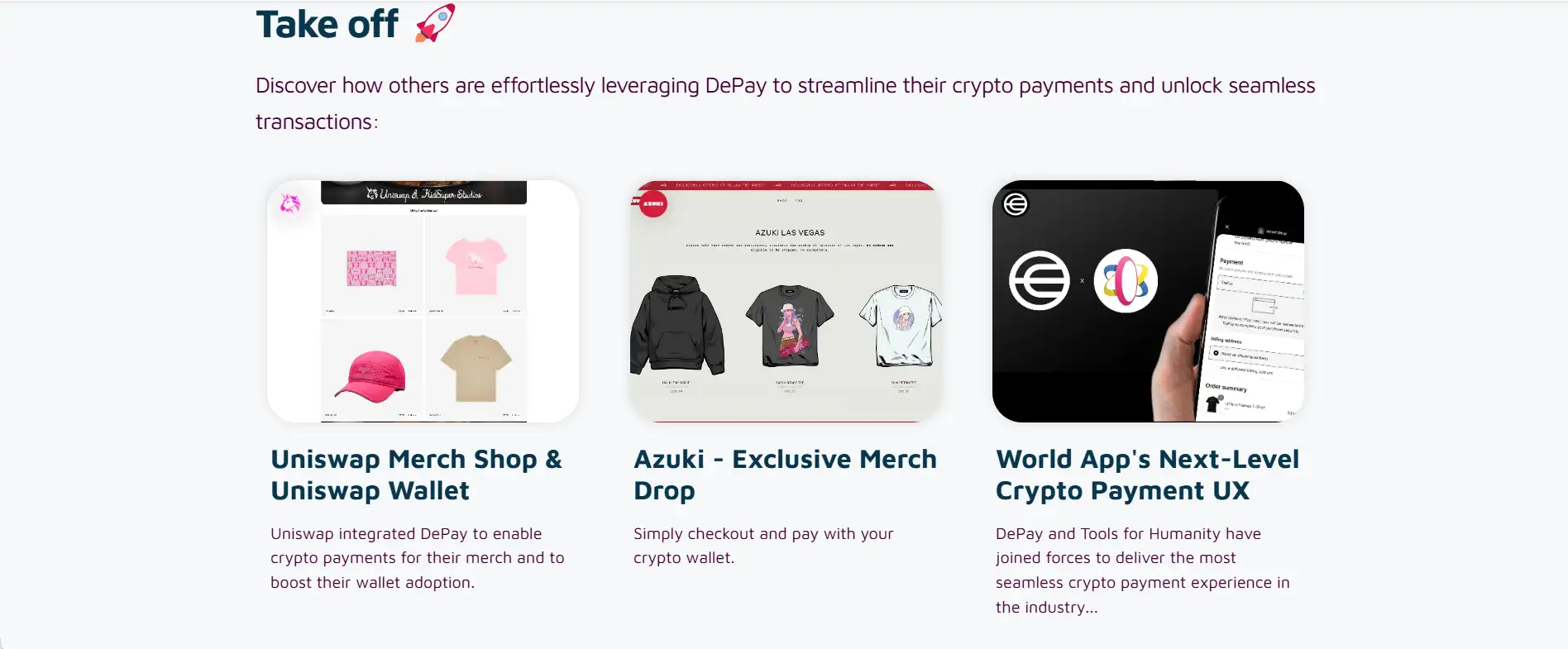 Projects like Uniswap, Azuki, Tools for Humanity’s World App, and Playbux already integrate DePay to streamline crypto payments. The platform supports use cases across e-commerce, merchandise drops, platform subscriptions, and even dynamic NFT-based pricing. It’s also compatible with leading platforms like WooCommerce, WordPress, and Shopify through native plugins.