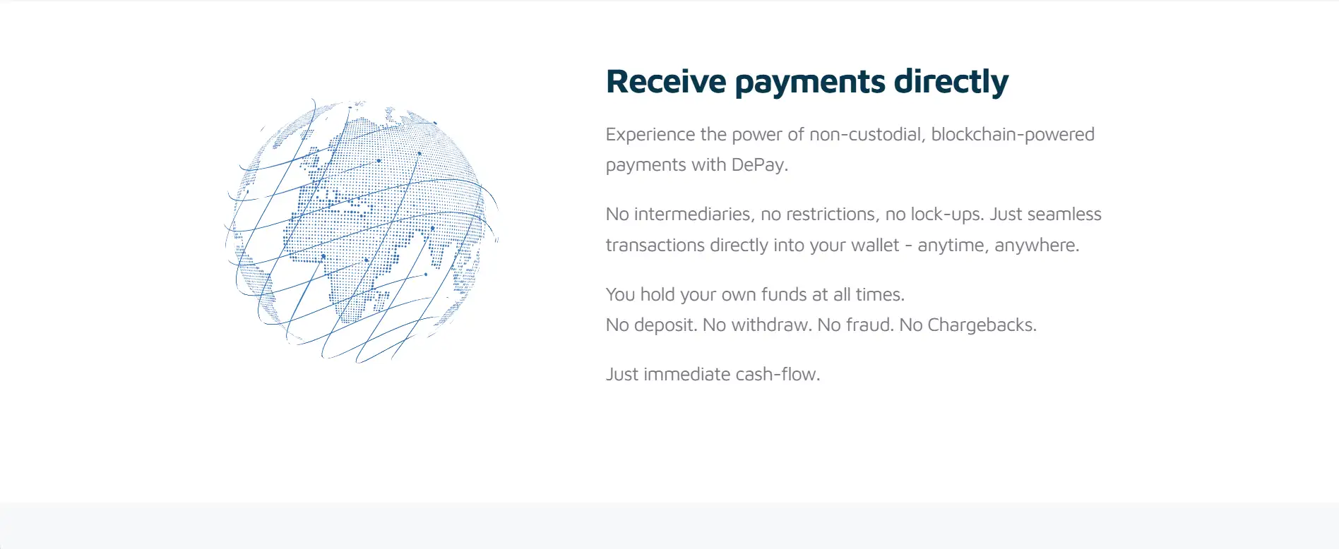DePay's architecture is entirely non-custodial, meaning the platform never holds or touches user funds. All payments are peer-to-peer and go directly to the merchant's wallet. This eliminates the risk of hacking, fund freezing, and third-party dependency. It also removes the need for complex withdrawal processes. With DePay, merchants maintain full control of their funds 24/7—no lockups, no chargebacks, and zero intermediaries.