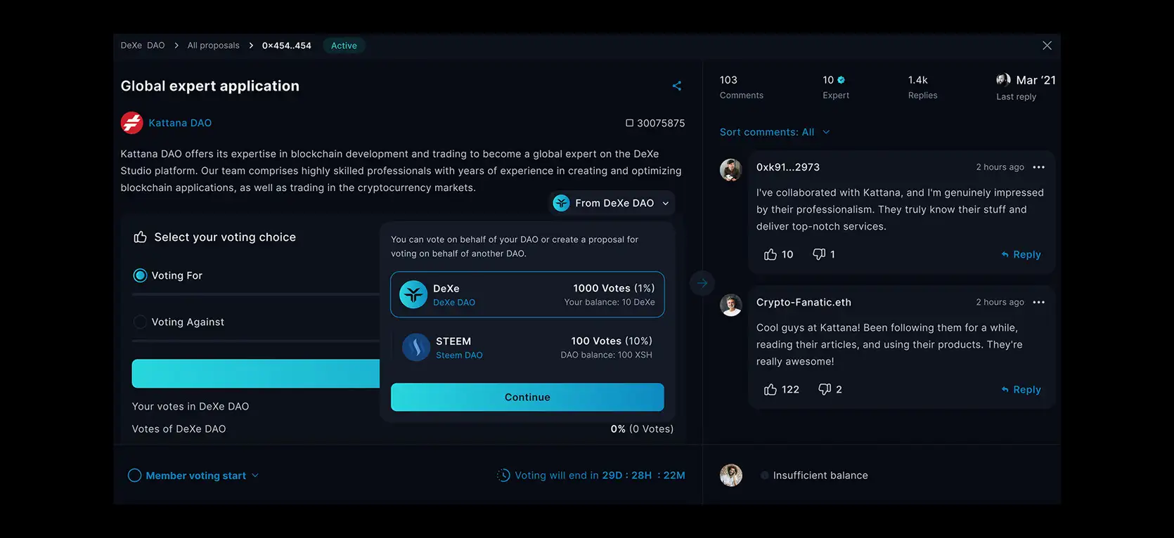 - Comprehensive Governance Tools: DeXe DAO Studio provides a variety of governance models, including token-based voting, delegated voting, and expert sub-DAOs. This flexibility allows organizations to tailor their governance structure to their specific needs.