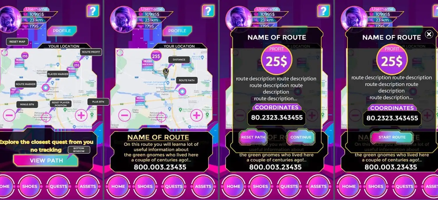 Players start their journey by purchasing NFT sneakers, which are essential for engaging in the game's activities. Once equipped with these digital assets, players can choose from various routes mapped out in their cities. As they walk these routes, they encounter AR elements that enhance the gaming experience. These elements include game objects, characters, and secret locations, which players can discover to earn additional rewards.