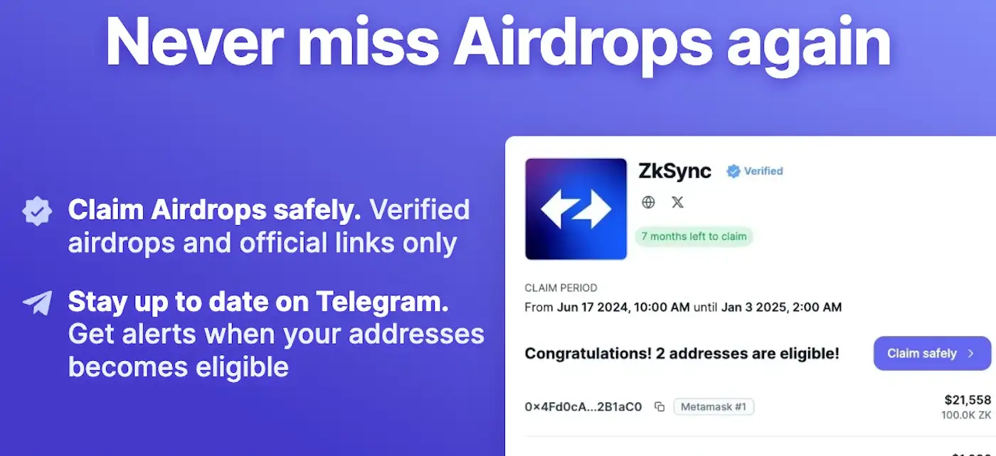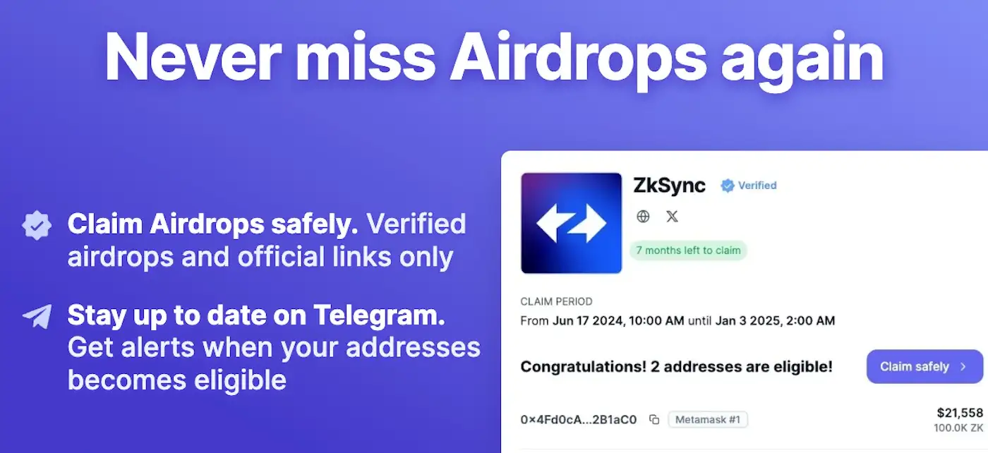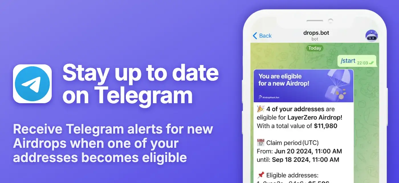 - Real-Time Telegram Alerts: Stay up to date with instant Telegram notifications when your wallet qualifies for an airdrop.