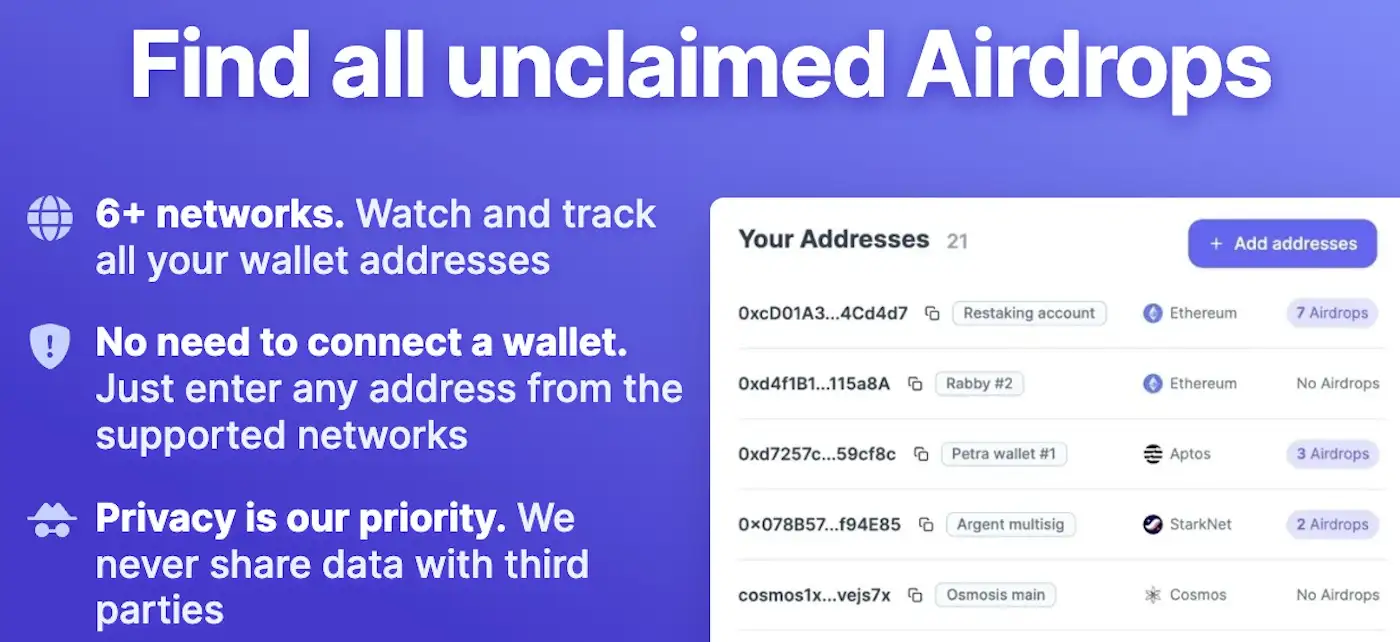 - Comprehensive Airdrop Tracker: Instantly check eligibility for 155+ ongoing airdrops across multiple networks.