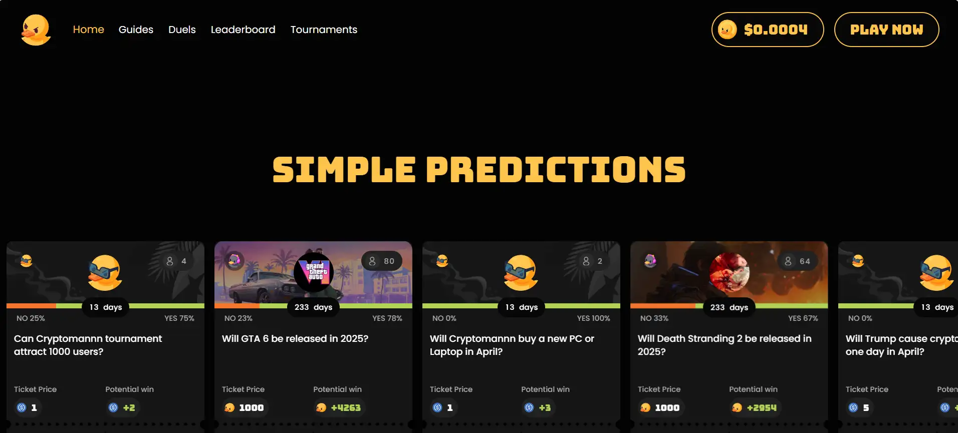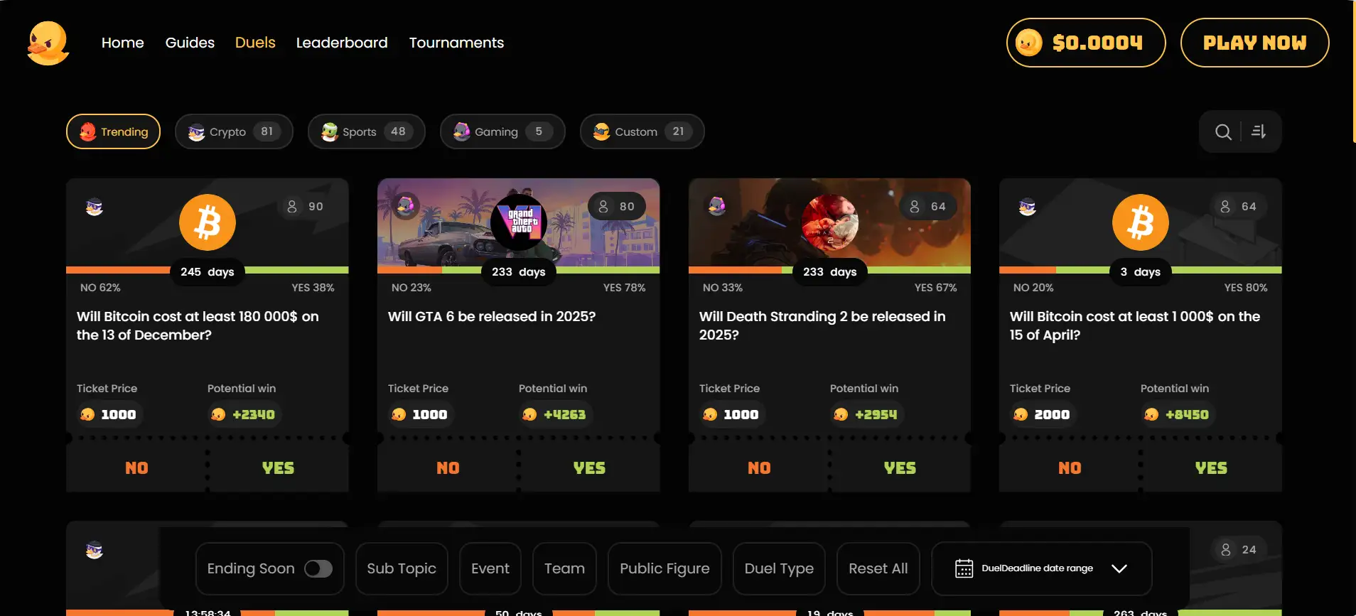 Duel Duck introduces a fully on-chain peer-to-peer prediction experience, gamifying how users interact with future outcomes by wagering on yes/no questions. These predictions are structured as "duels" that anyone can create. Whether it's forecasting if Bitcoin will reach a certain price or predicting pop culture events like the release date of GTA 6, players stake tickets (denominated in USDC or Duel Duck Points) to back their opinions and potentially earn big returns.