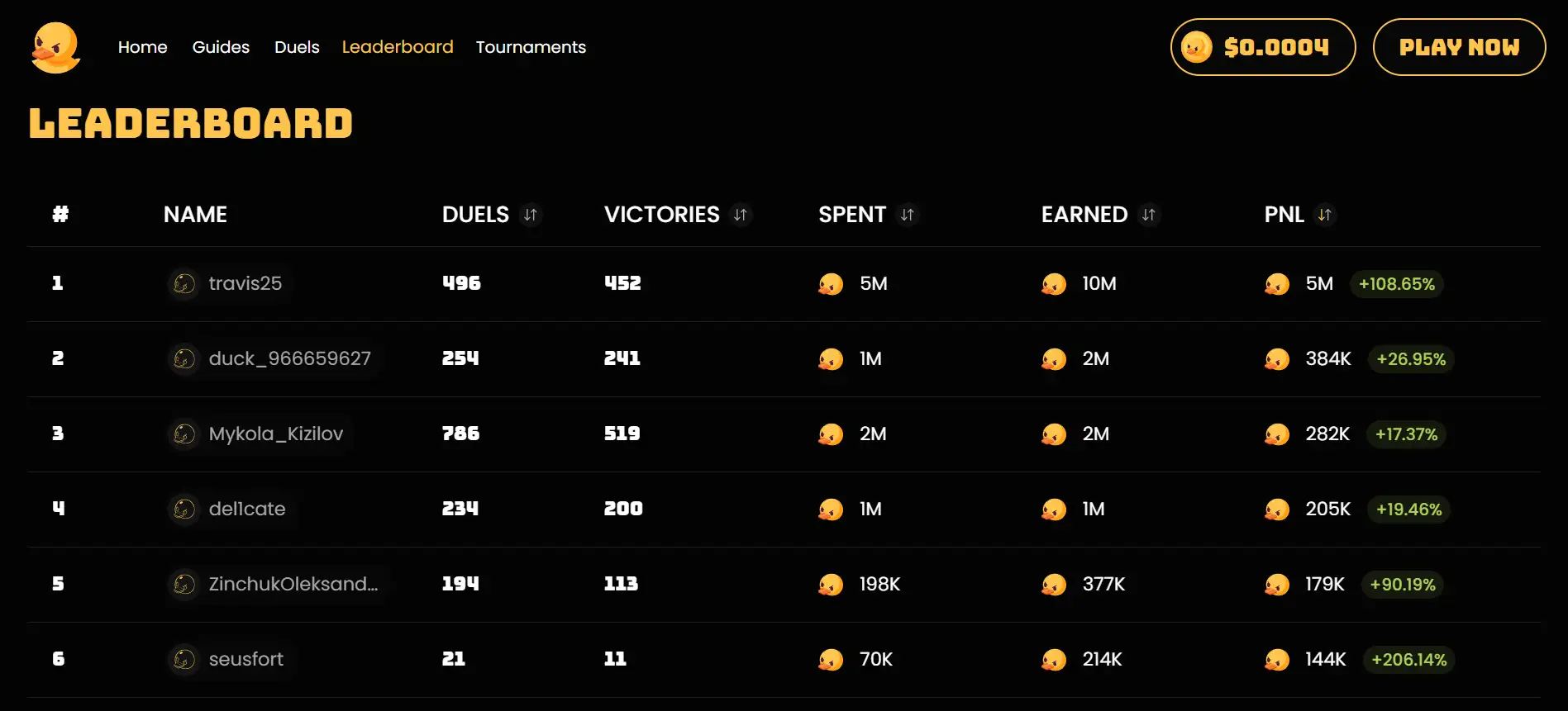 - Leaderboard and Tournaments: Compete globally to climb ranks and win real USDC rewards through Duel Duck competitions.