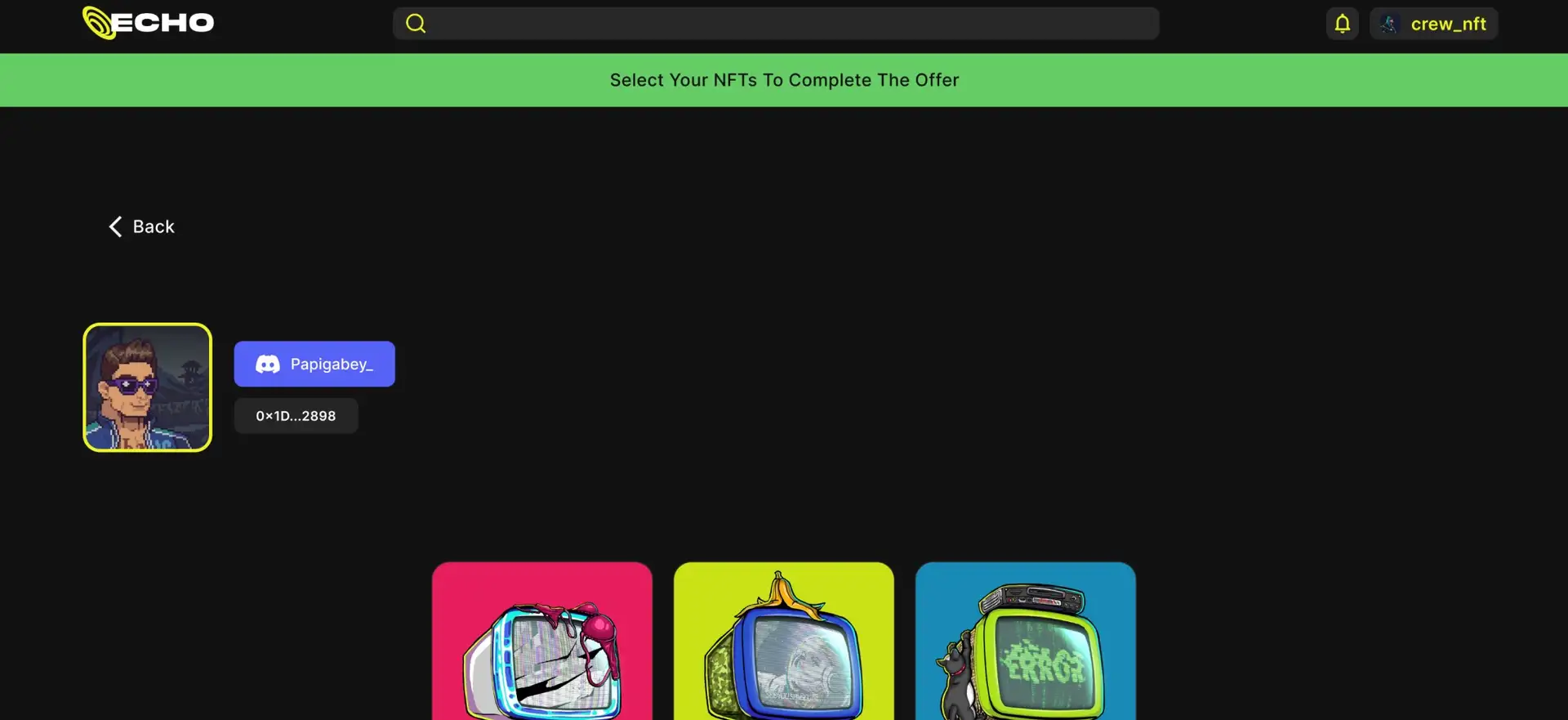 - Initiate a Trade: Use Echo’s escrowless smart contract system to initiate a trade. Select the NFT you wish to trade and specify the terms of the transaction. The smart contract will automatically execute the trade once the conditions are met.