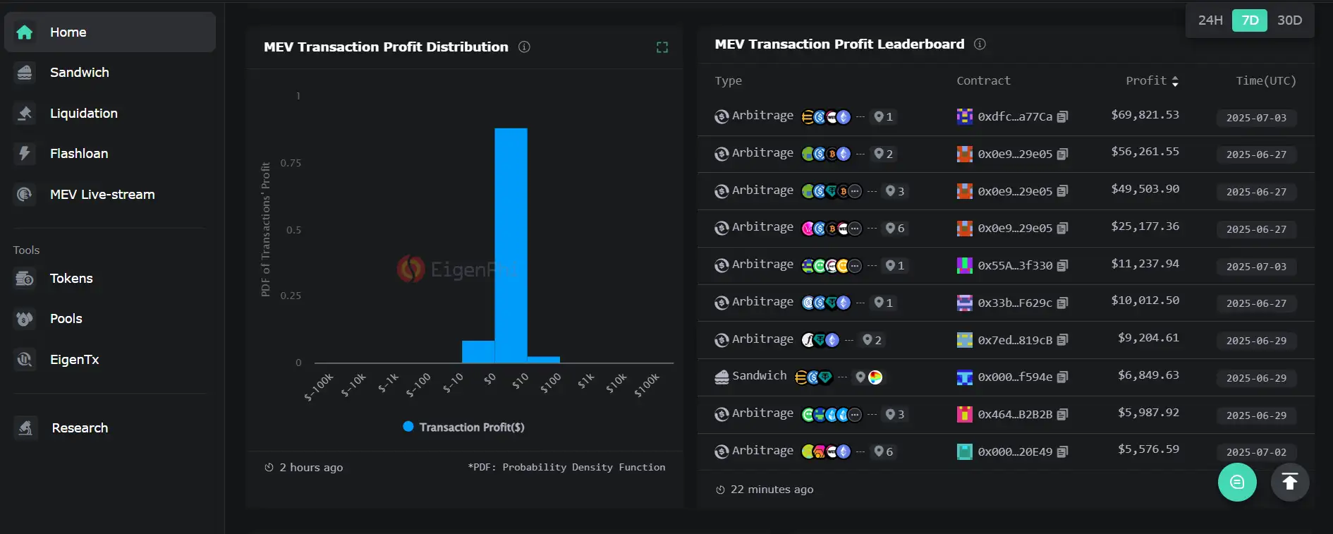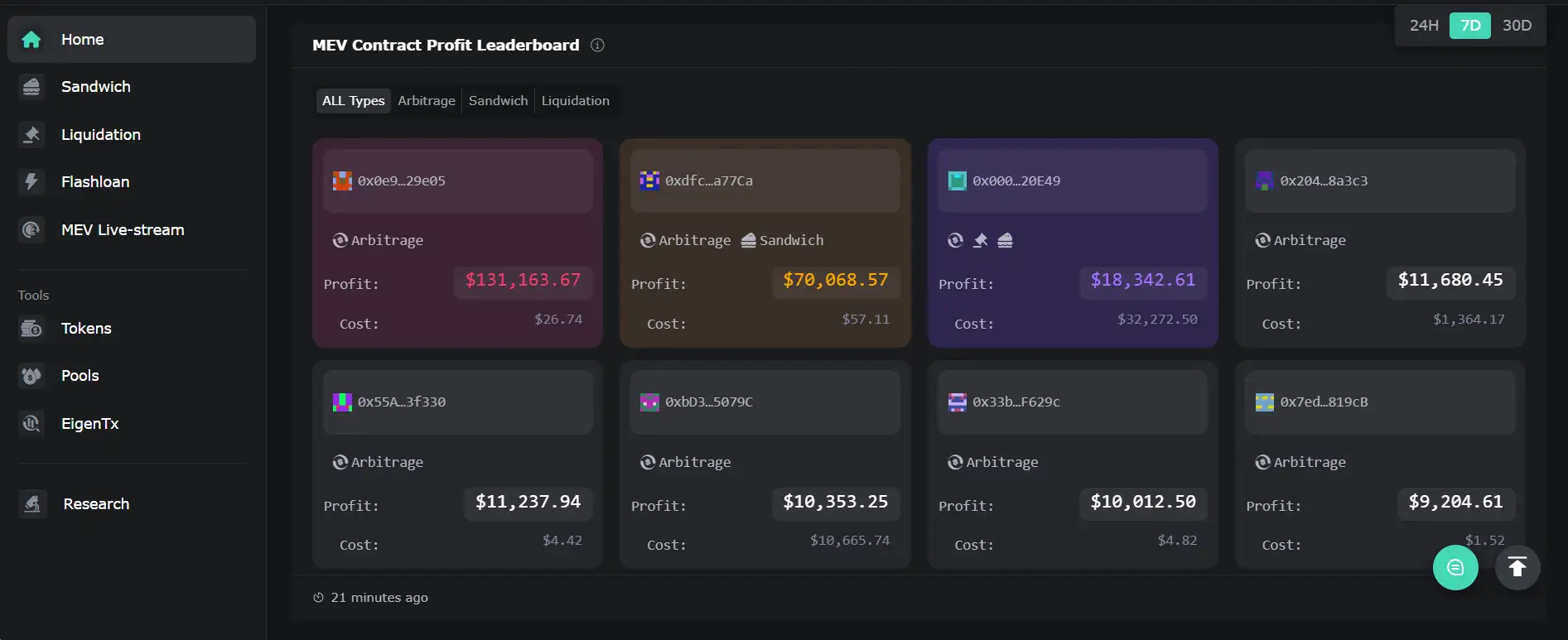 - Monitor Leaderboards: Head to the MEV Contract Profit Leaderboard or Tx Profit Rankings to identify top-performing searchers or active exploits.