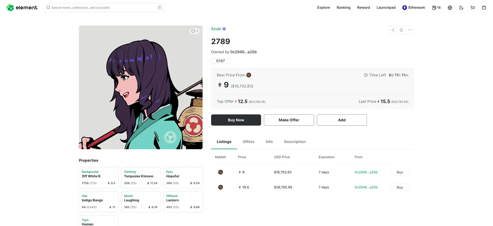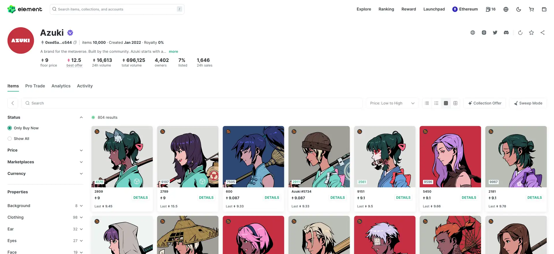 - Explore Collections: Browse through the verified collections on Element Market. Use the search and filter options to find NFTs that interest you.