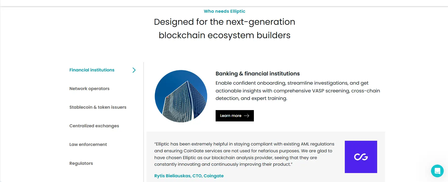 - Training and Certification: Offers expert-led education through Elliptic Learn to train teams on blockchain forensics and compliance.