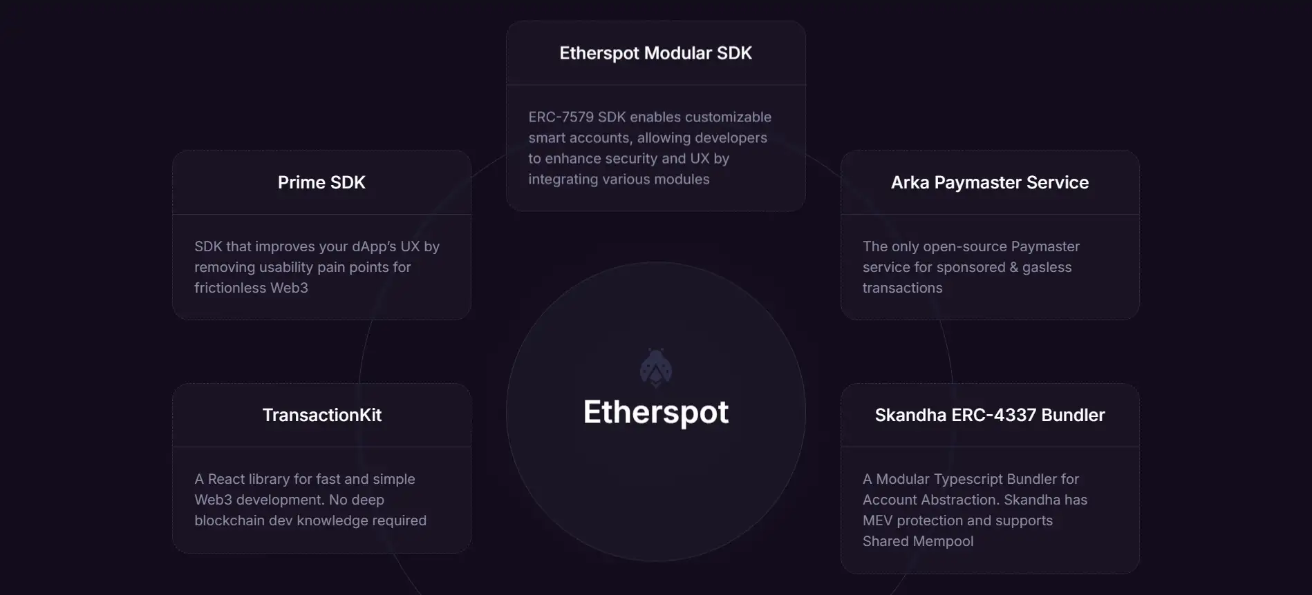 Etherspot is a full-stack infrastructure platform designed to transform the way developers and users interact with the Web3 ecosystem. Built on Account Abstraction and Chain Abstraction technologies such as ERC-4337 and ERC-7579, Etherspot simplifies the creation of seamless, gas-efficient, and user-friendly dApps. The platform offers modular, open-source tooling that removes traditional blockchain UX complexities—empowering developers to onboard Web2 users with minimal friction.