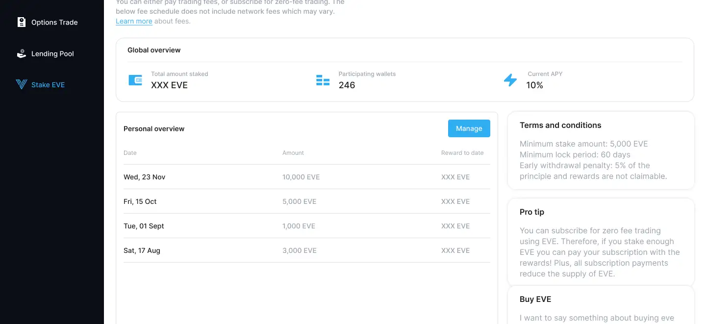 - Subscribe for Zero Fee Trading: Use the native EVE token to subscribe for zero-fee trading. This can be done within the DApp interface by following the on-screen instructions.