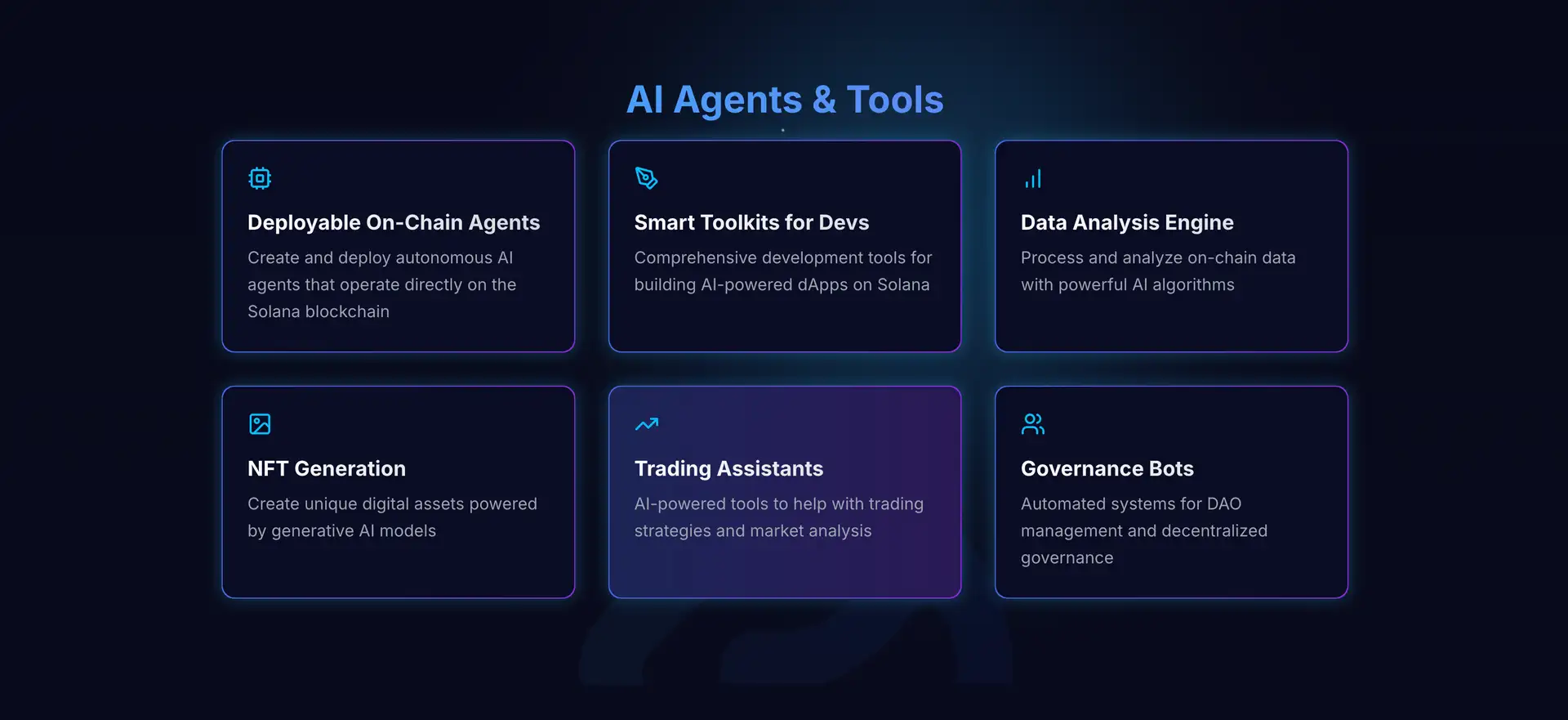 At the core of the project is the ability to deploy autonomous AI agents directly onto the blockchain. These agents are capable of real-time data processing, decentralized governance, generative NFT creation, trading strategy automation, and on-chain analytics. This architecture leverages Solana's high-speed validator network and cross-program invocations to enable fast, low-cost AI execution. The AI Processing Layer includes a custom inference engine, decentralized model registry, and optimized compute framework, offering a next-gen infrastructure for AI applications on-chain.