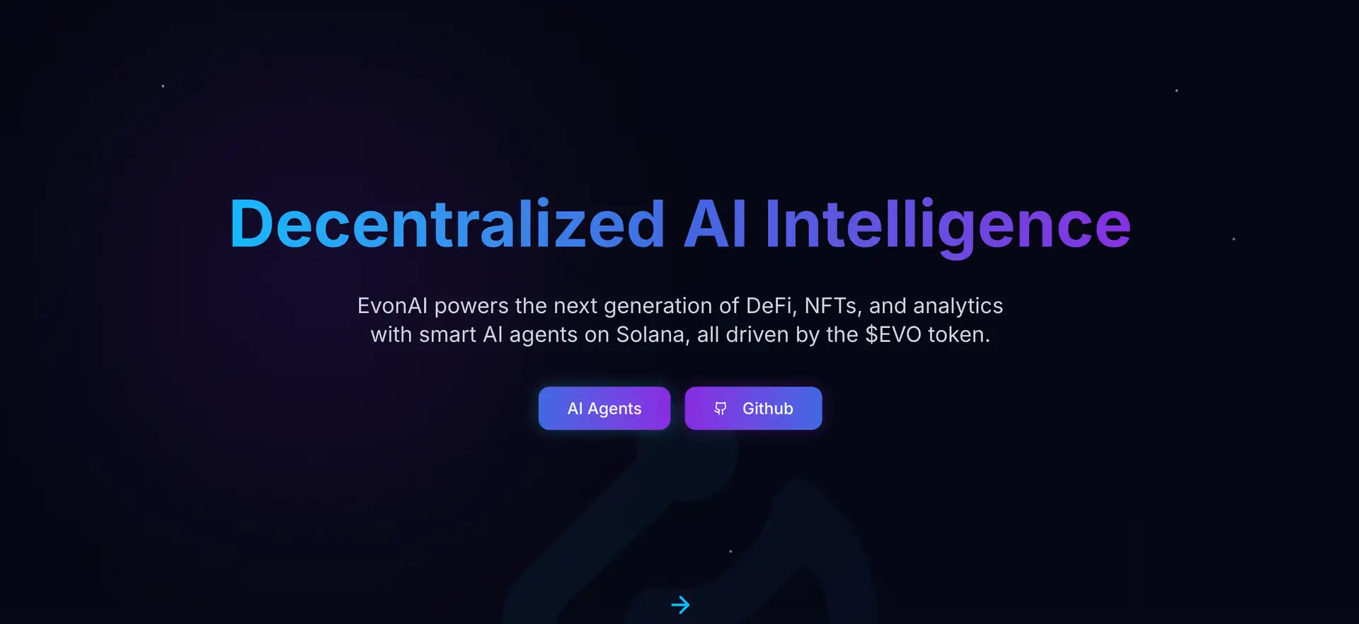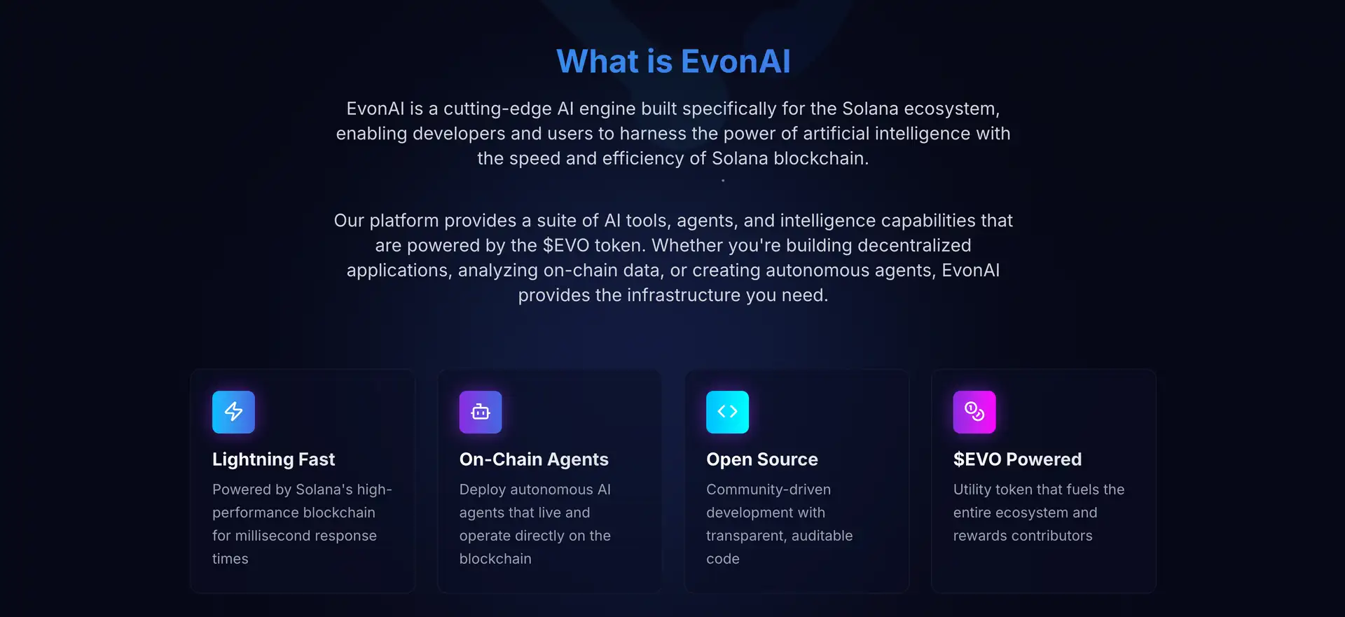 EvonAI is a decentralized artificial intelligence infrastructure project purpose-built for the Solana blockchain. It empowers developers, traders, and decentralized organizations to deploy smart, autonomous agents capable of operating directly on-chain with sub-second performance. The project's vision is to bridge the rapidly expanding AI market with the speed and scalability of Web3, delivering real-time AI tools and infrastructure to a broader community.