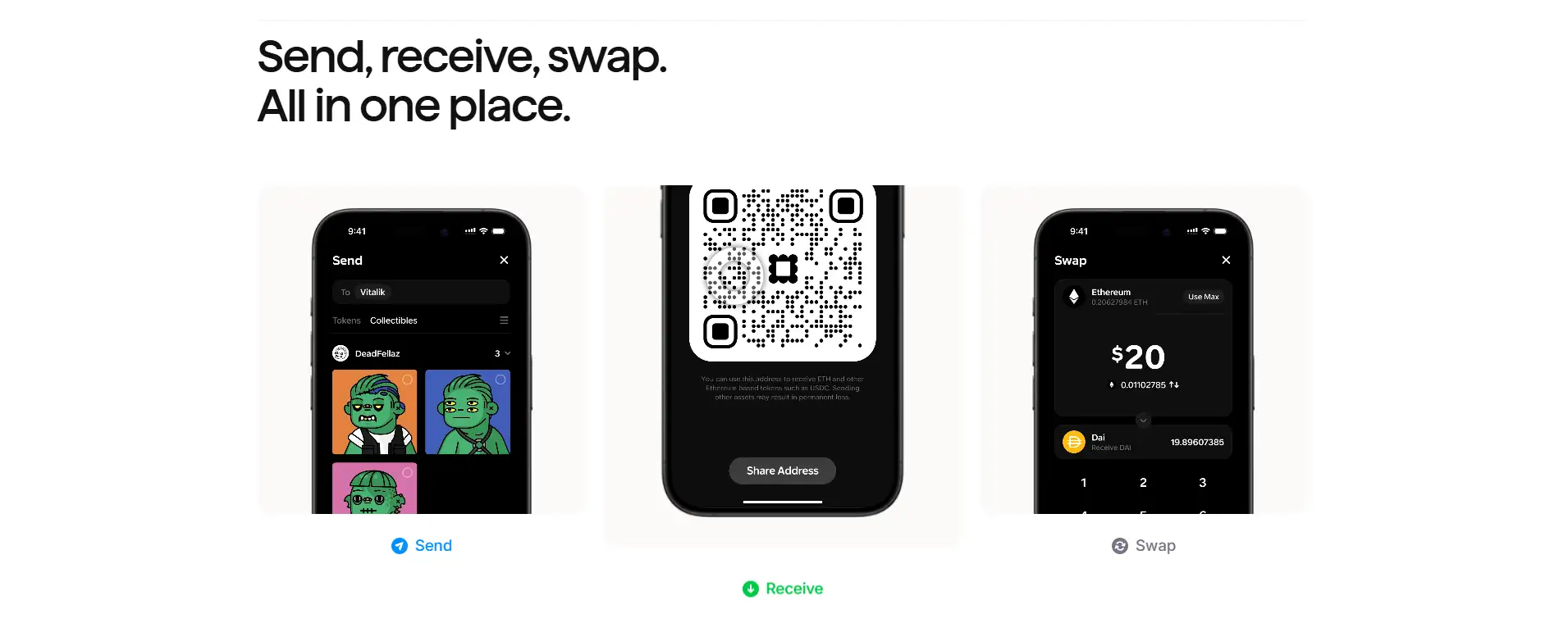 - Send, Receive, Swap: Use the intuitive interface to send assets with minimal taps, scan to receive via QR, or access the swap engine for fast decentralized trades.