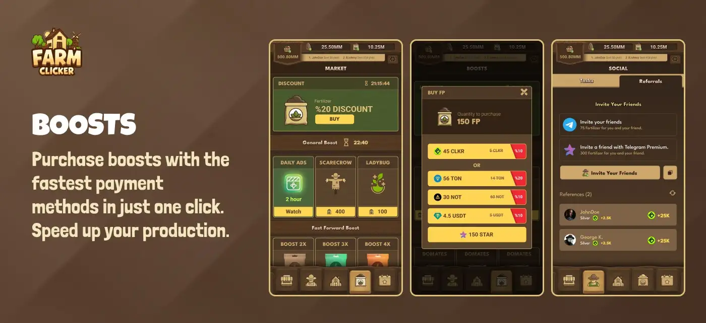 Players are encouraged to engage daily by completing farming tasks, earning token rewards, and participating in social interactions. The more active a player is, the faster they can expand their farm and increase their earnings. Weekly events add a competitive element, driving players to upgrade their farms and earn a larger share of the daily CLKR token distribution. Clicker Farm also incentivizes inviting friends through Telegram, enhancing the community-driven experience.