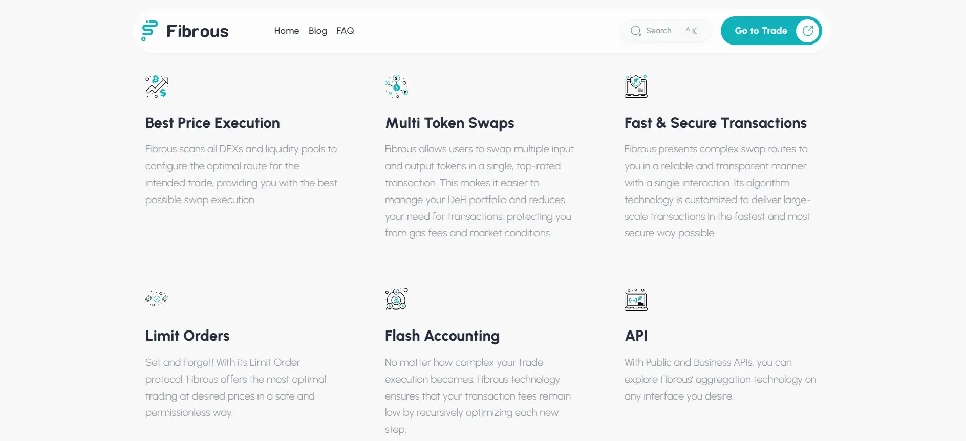 Built with features like Batch Swaps, Limit Orders, and Flash Accounting, Fibrous combines an institutional-grade engine with transparent pricing and smart contract execution. It supports both everyday traders and enterprise clients through an intuitive app and powerful APIs—without requiring users to give up custody of their assets. Whether you're optimizing token swaps or managing a DeFi portfolio, Fibrous provides best-in-class execution without compromise.