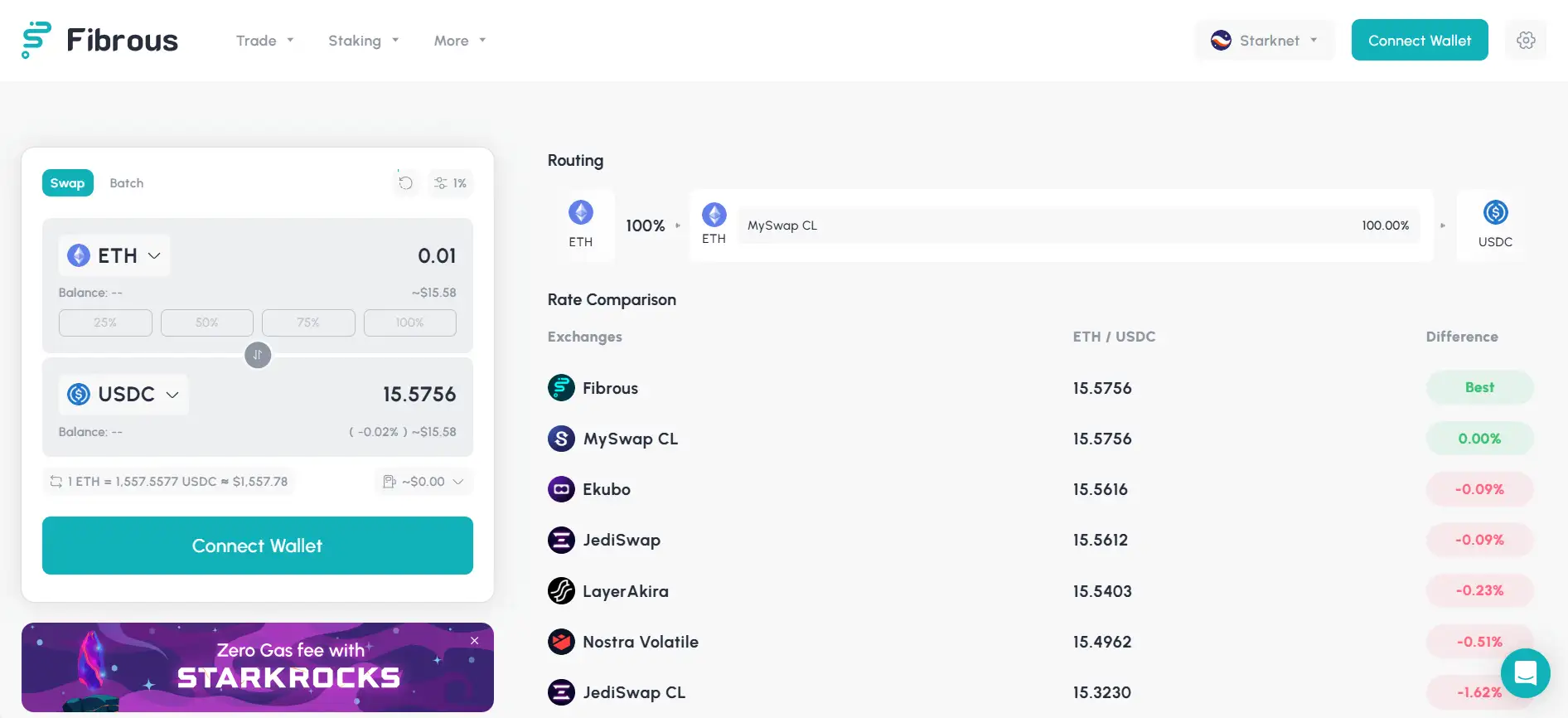 - Zero Fees for Starkrock Holders: Holders of Starkrock NFTs enjoy zero service and gas fees when trading on Starknet through Fibrous.