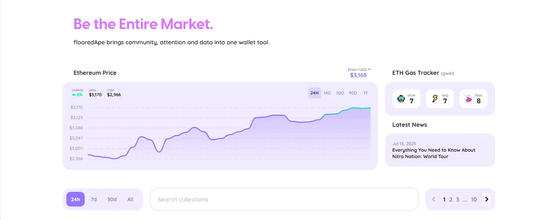flooredApe is a powerful NFT wallet and analytics tool that merges portfolio tracking, market intelligence, and onchain transparency into one seamless experience. Designed for both collectors and power users, flooredApe brings structure and simplicity to the often chaotic world of NFTs, enabling users to manage their assets, monitor market trends, and track other wallets with just a few clicks.