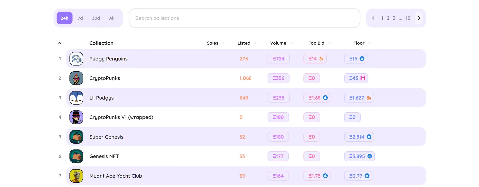 - Market Overview: Track the top 20 trending collections and filter by sales, listings, bids, and volume across 14D, 30D, 90D, and yearly intervals.