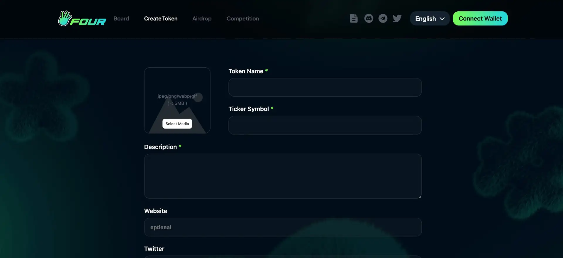 - Connect to Four.Meme: Visit Four.Meme and click "Connect Wallet" to link your wallet to the platform. Ensure that you're connected to the Binance Smart Chain network.