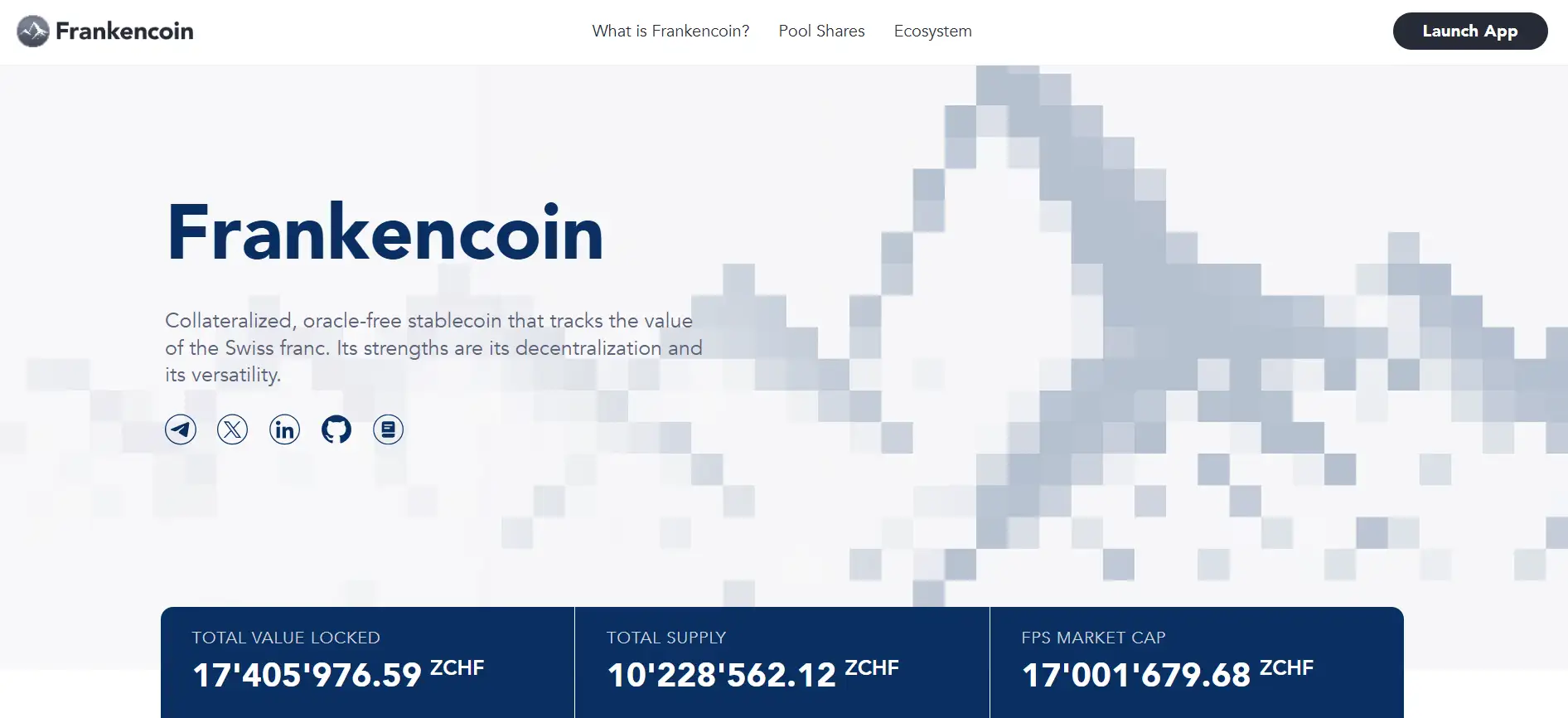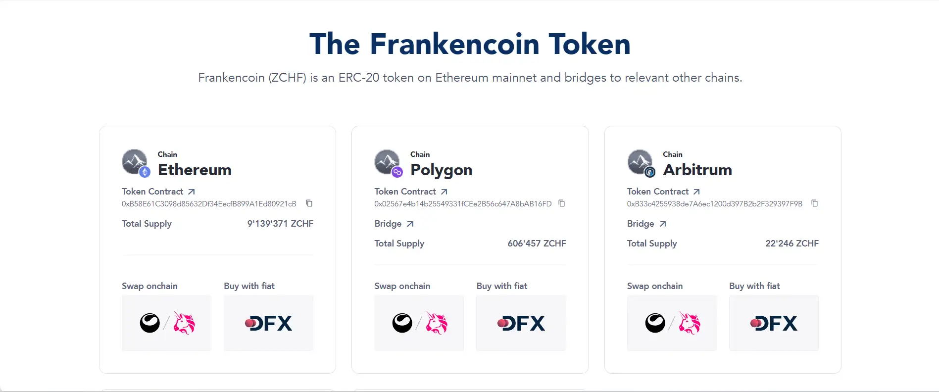Frankencoin is a fully decentralized and oracle-free stablecoin protocol that mirrors the value of the Swiss Franc (CHF). It operates on the Ethereum mainnet and supports multiple chains, including Arbitrum, Polygon, Optimism, and Base. As a Swiss innovation rooted in academic research, Frankencoin presents a unique alternative to dollar-pegged stablecoins, providing CHF-denominated digital value without the reliance on centralized issuers or oracles. This empowers users with complete sovereignty over collateral and minting processes.