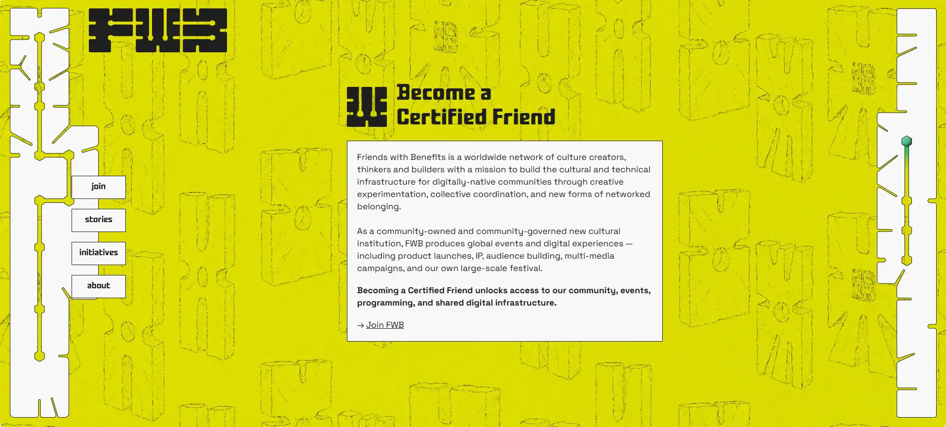 - Certified Friend Membership: Becoming a Certified Friend unlocks access to curated events, internal projects, collaborative tools, and deeper governance participation within the FWB ecosystem.