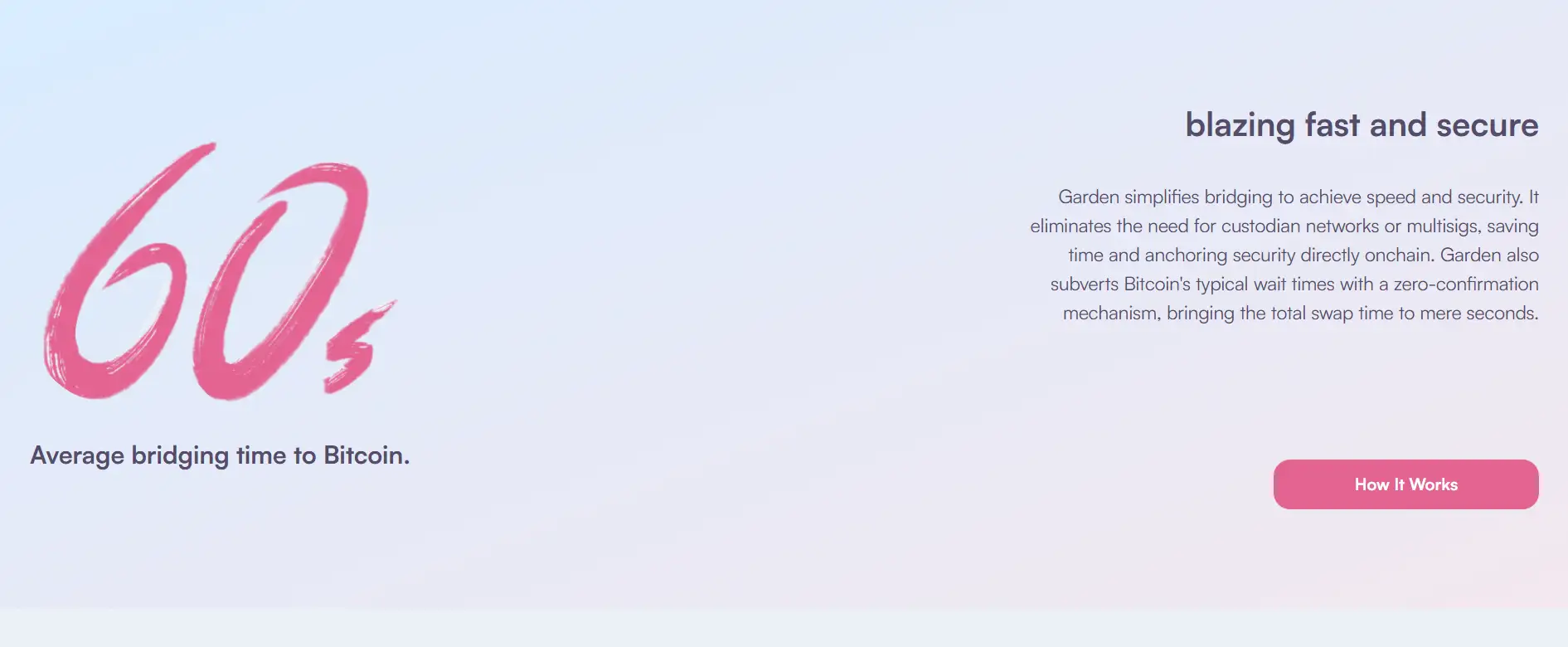 Garden uses a unique architecture that combines intent-based logic with atomic swaps to enable ultra-fast, trustless Bitcoin bridging. Unlike traditional bridges that wait for multiple confirmations, Garden uses a zero-confirmation mechanism and direct on-chain vaults. This setup bypasses delays and allows assets to be transferred across chains like Ethereum, Arbitrum, and Solana in about 30 seconds without custodians or liquidity pools.