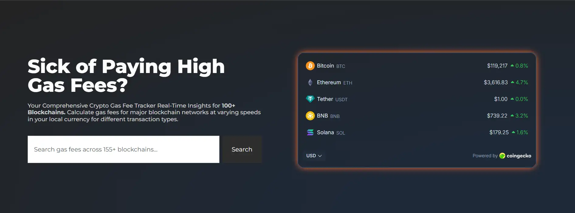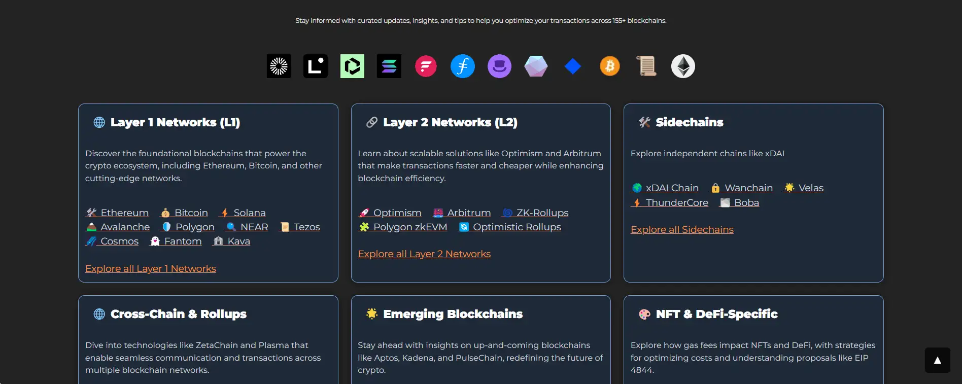 - Browse Chains: Scroll or search through 155+ supported blockchains to view real-time gas fee data.