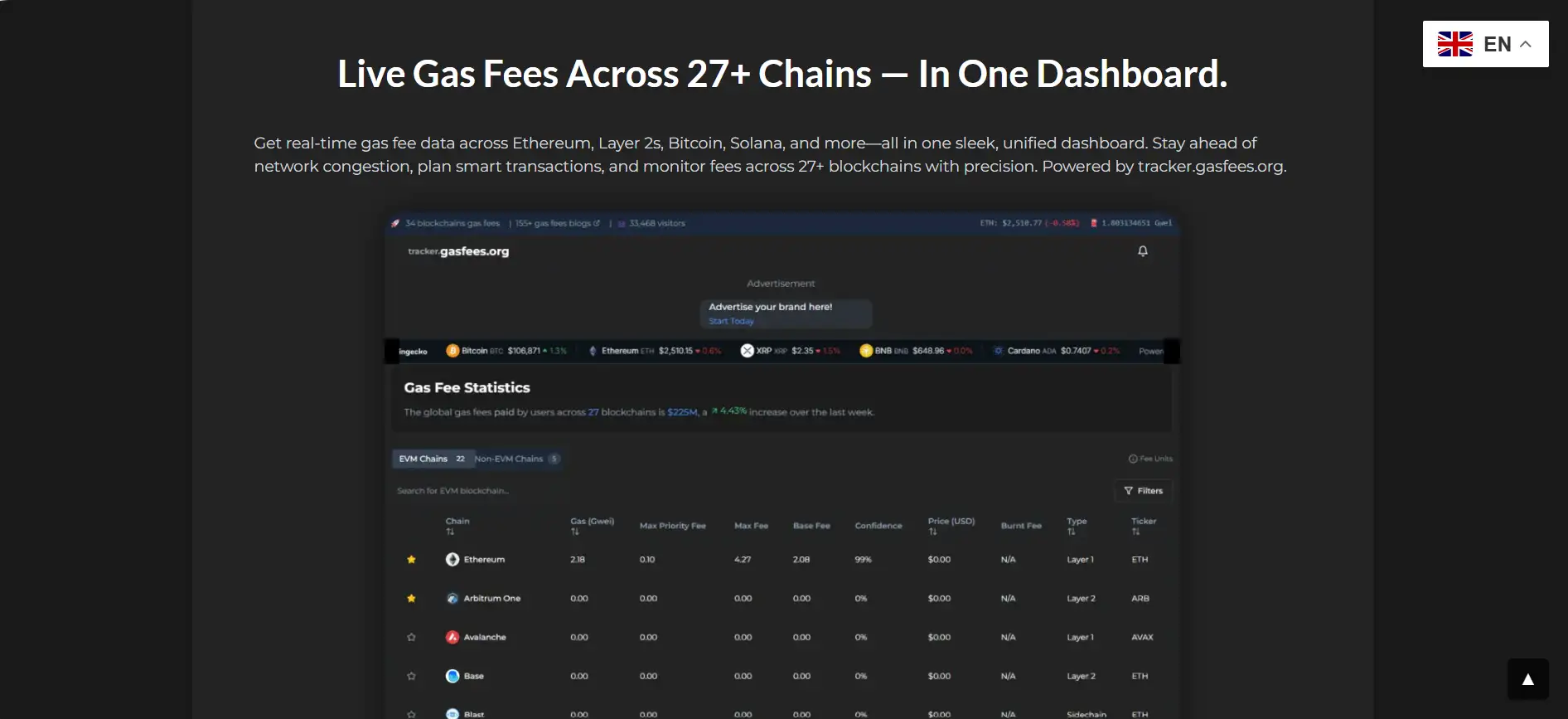 Another flagship tool is the live Tracker Dashboard, accessible via tracker.gasfees.org. This dashboard aggregates gas prices from 27+ blockchains into a single, visual interface that helps users anticipate high-fee windows and optimize their transaction timing.
