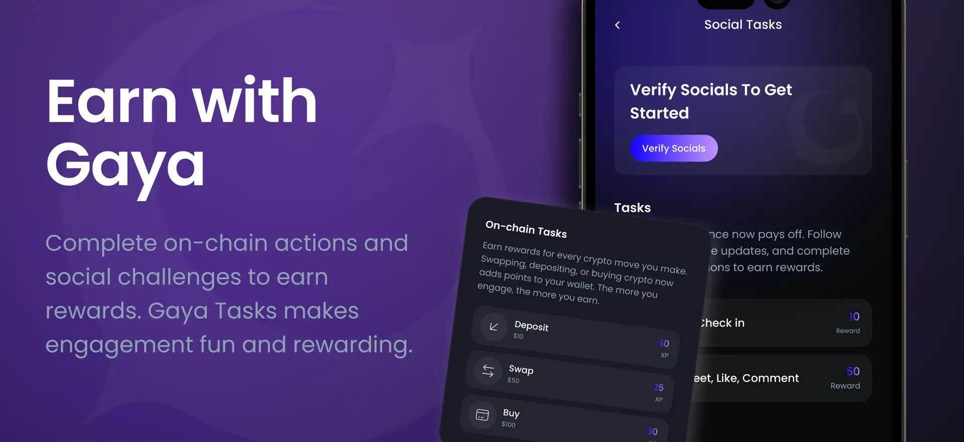 The Gaya Wallet XP system rewards users with points (XP) for every action—swaps, referrals, staking, and completing tasks. These XP points place you on a real-time leaderboard. Top users each day or week can win USDT prizes, qualify for token airdrops at TGE, and unlock higher tiers of in-app rewards. It's a fun and competitive way to earn while using Gaya Wallet.