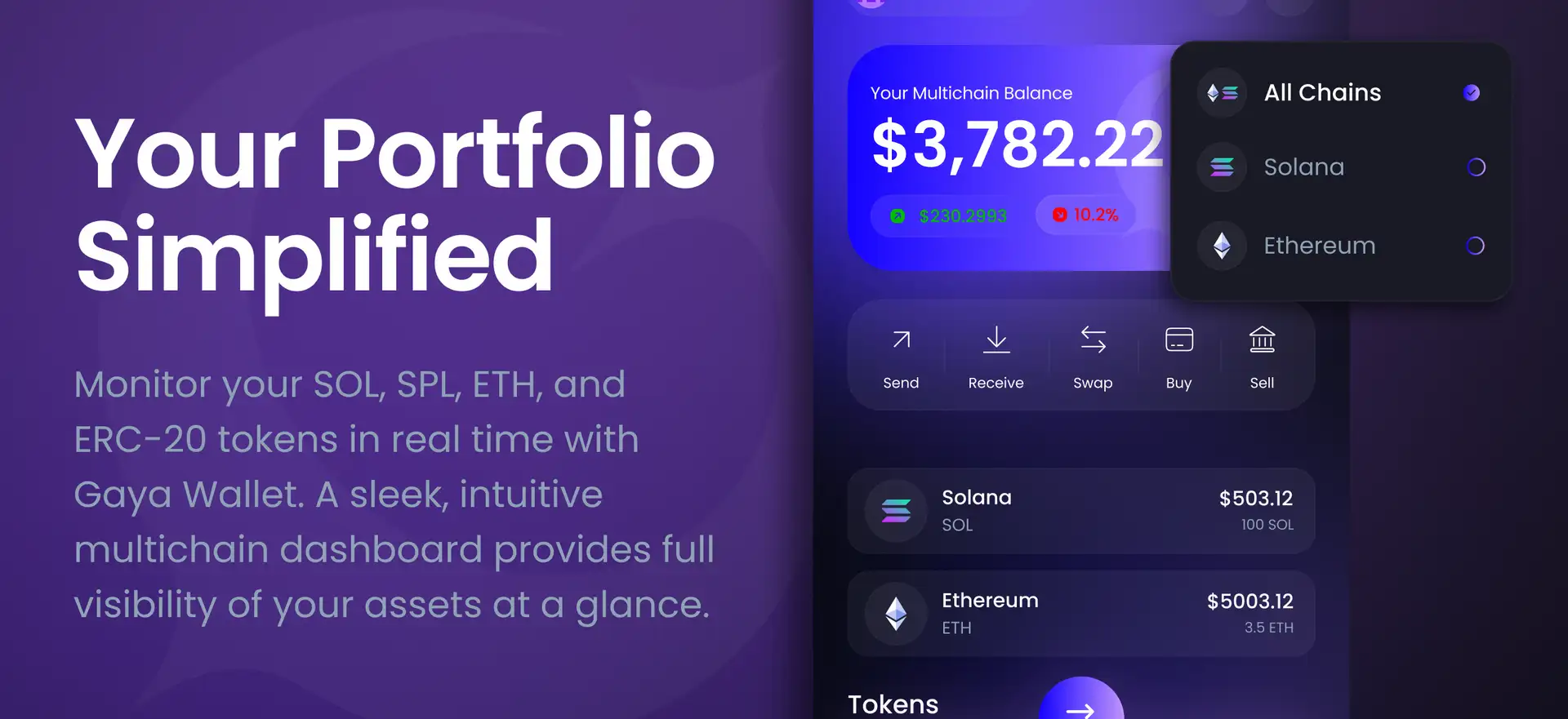 Gaya Wallet is a full-featured non-custodial crypto wallet that brings powerful Web3 tools together under a single interface. More than just a storage solution, it is an interactive crypto hub designed for users to own, earn, and explore the blockchain universe. With support for major chains like Ethereum, Solana, BSC, and others, the wallet offers multi-chain compatibility right out of the box.