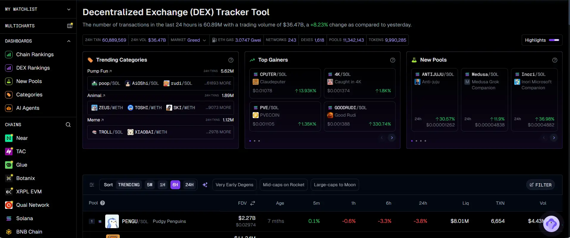 The platform currently supports trending chains such as Ethereum, Solana, Base, Arbitrum, Polygon, BNB Chain, zkSync, Blast, and many emerging L2s and L1s. The real-time dashboard is updated continuously, tracking over 6 million tokens and their market behavior. Its utility spans from meme token traders to institutional DeFi analysts, offering tools that adapt to a wide variety of user needs.