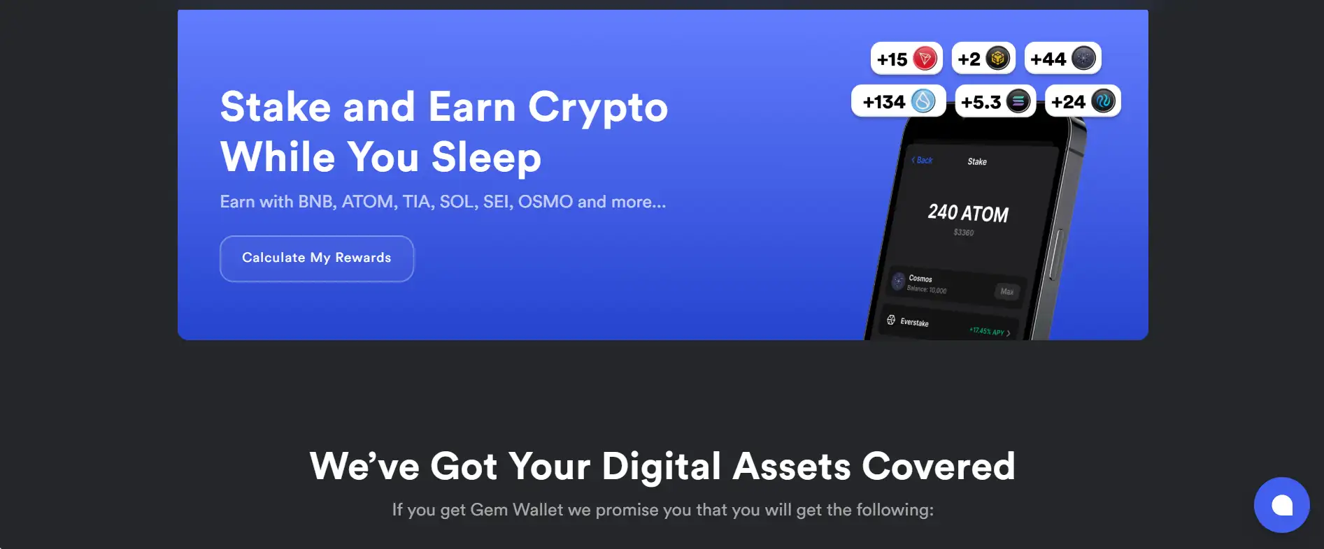 Yes. Gem Wallet supports flexible staking options that vary by network. Some assets like SOL, ATOM, SEI, OSMO, TON, and ETH allow you to stake and earn rewards while retaining full custody. You can review estimated APYs using the built-in staking calculator. The wallet prioritizes non-custodial, flexible staking so you don’t need to lock funds for long periods unless you choose to.