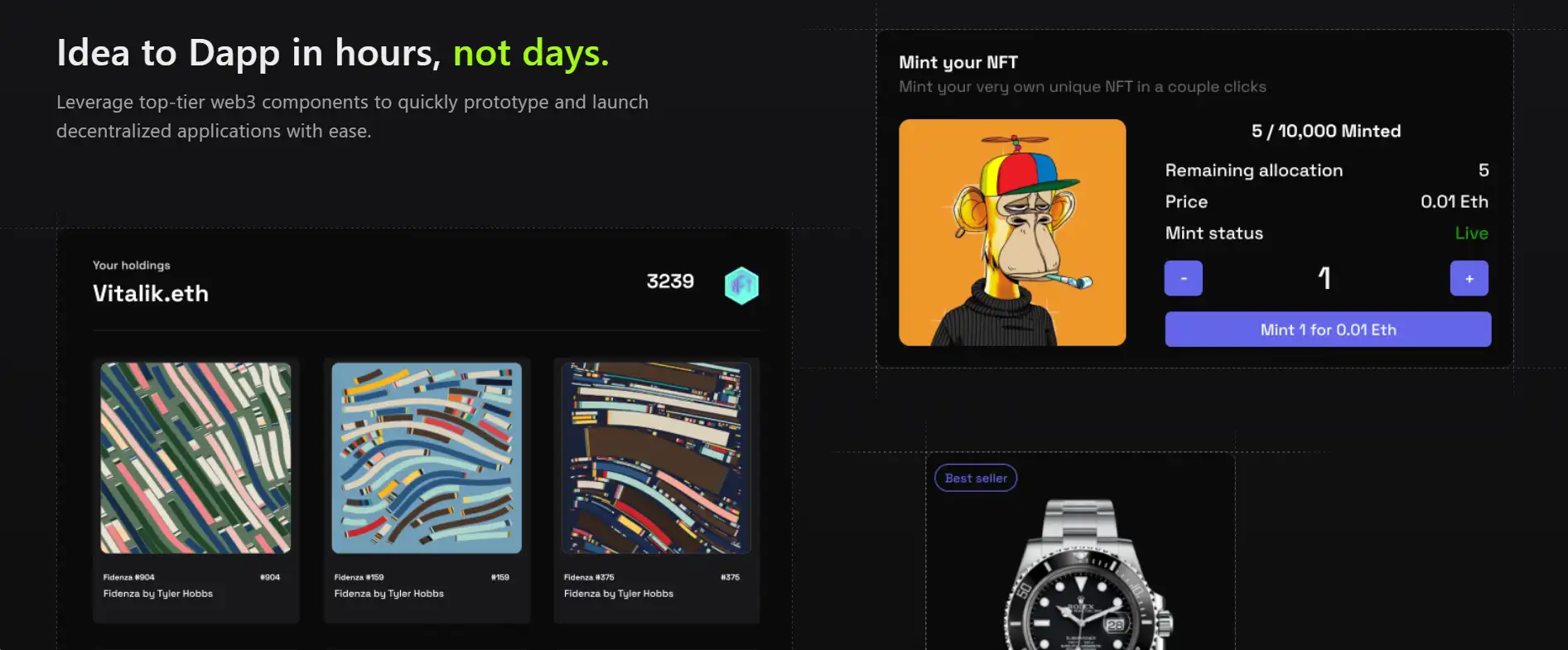 - Test and Deploy: Once your components are configured, launch your dApp confidently with production-ready modules.