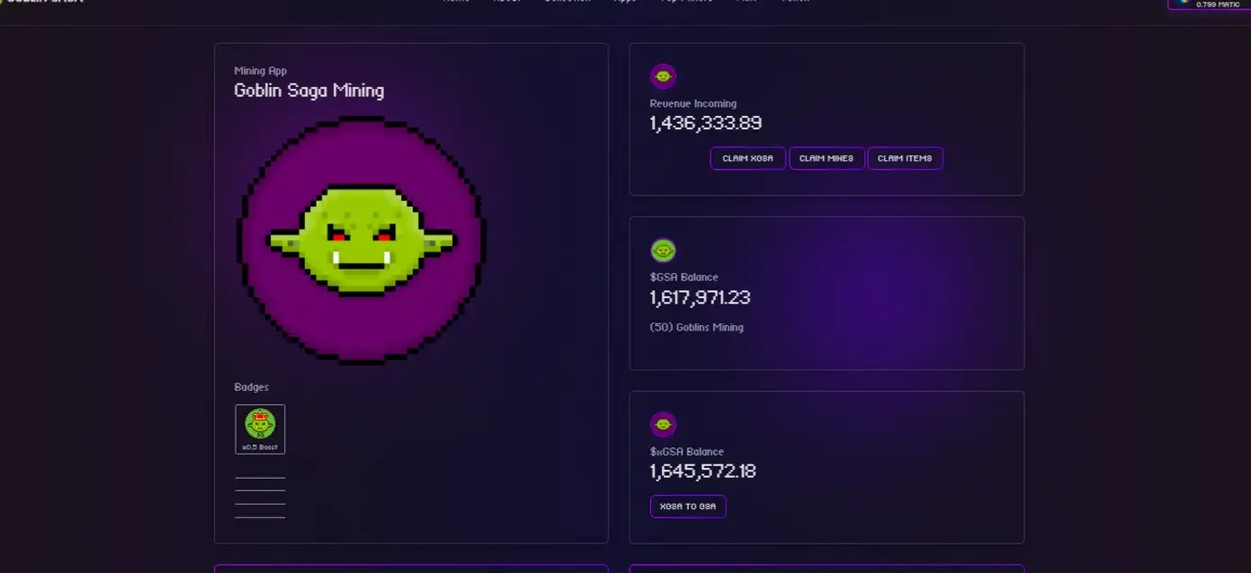Your Goblin NFTs directly affect your mining rewards. The rarity and traits of each goblin NFT determine its mining power. Higher rarity goblins yield more $xGSA tokens, giving you a significant advantage when staking. Mining with rarer goblins helps you accumulate tokens faster within the ecosystem.
