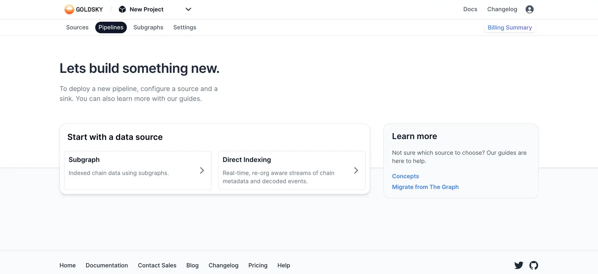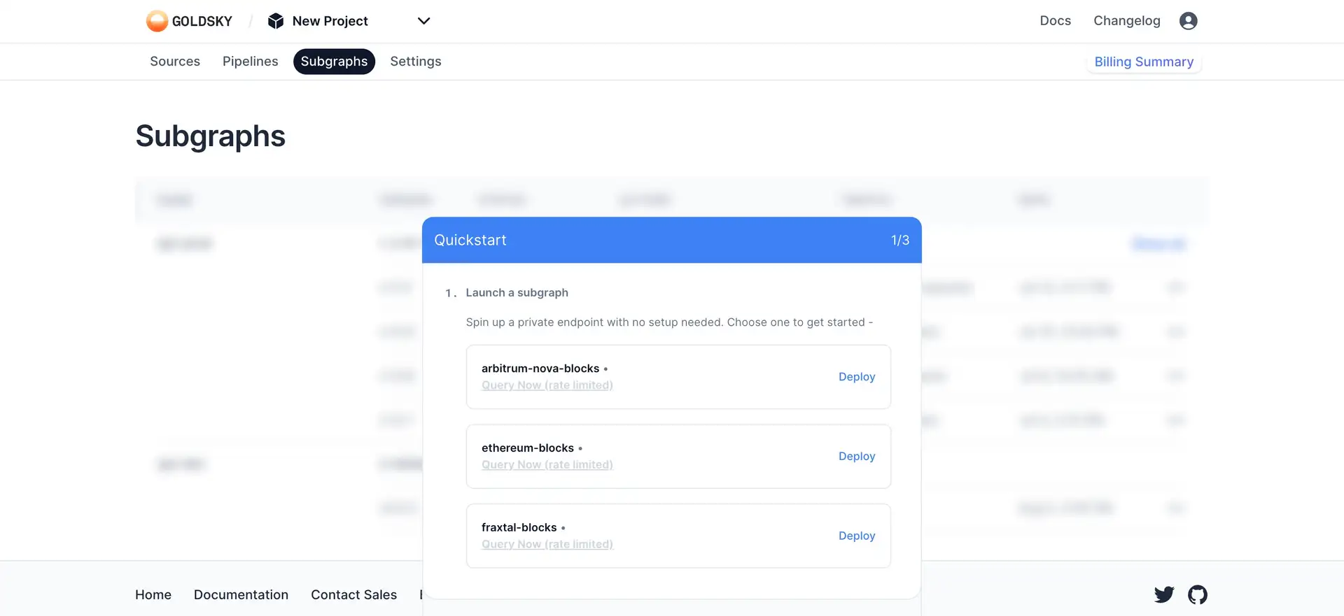- Access the Dashboard: After signing up, log in to your account to access the Goldsky dashboard. Here, you can explore the available products and services, including Subgraphs and Mirror.
