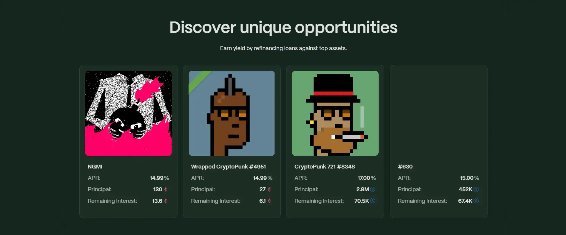 - Borrow Against NFTs: Select a whitelisted NFT, choose from loan offers, and borrow WETH or USDC. No gas fees are required for listing.