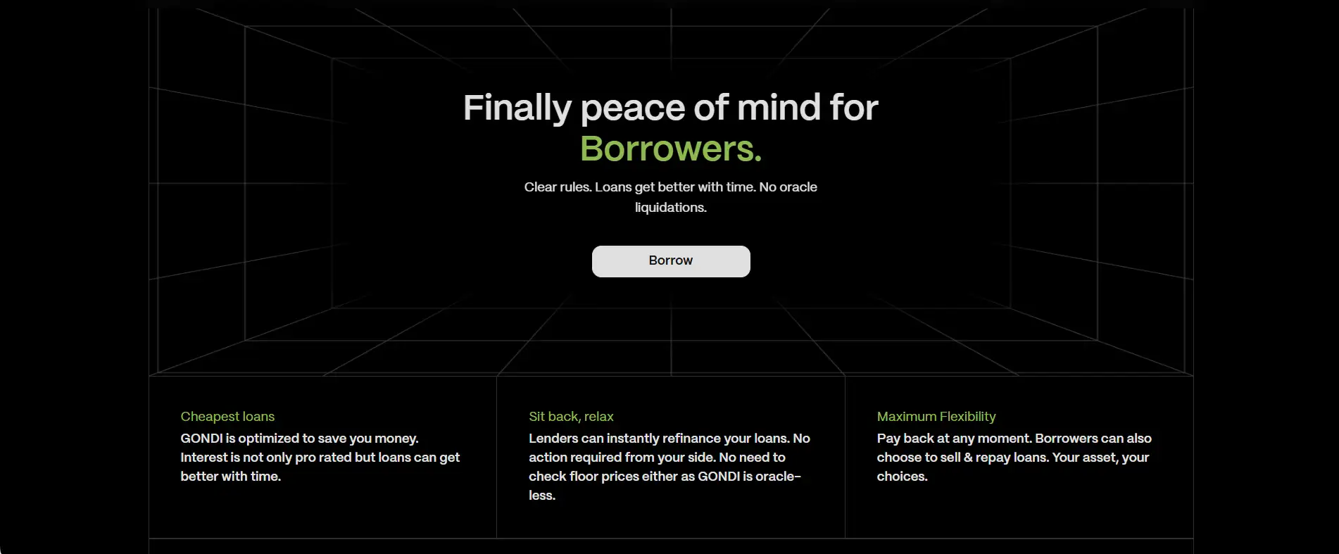 - Oracle-Free Borrowing: Borrowers are protected from sudden liquidations caused by unreliable price feeds, as GONDI does not use oracles.