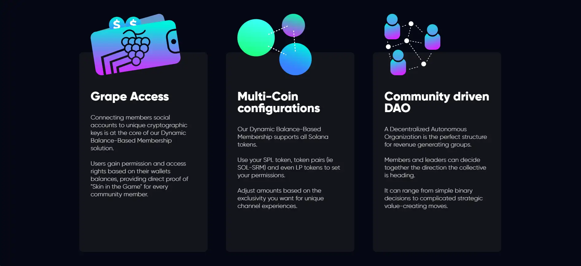 Launched on the Solana blockchain, Grape Protocol reimagines how communities form and interact in the decentralized world. It introduces a unique approach to social membership and moderation through its Dynamic Balance-Based Membership model. This system links social identities (like Discord usernames) to cryptographic keys and wallet balances, giving community leaders and DAOs precise control over user roles, permissions, and benefits—all based on on-chain activity.