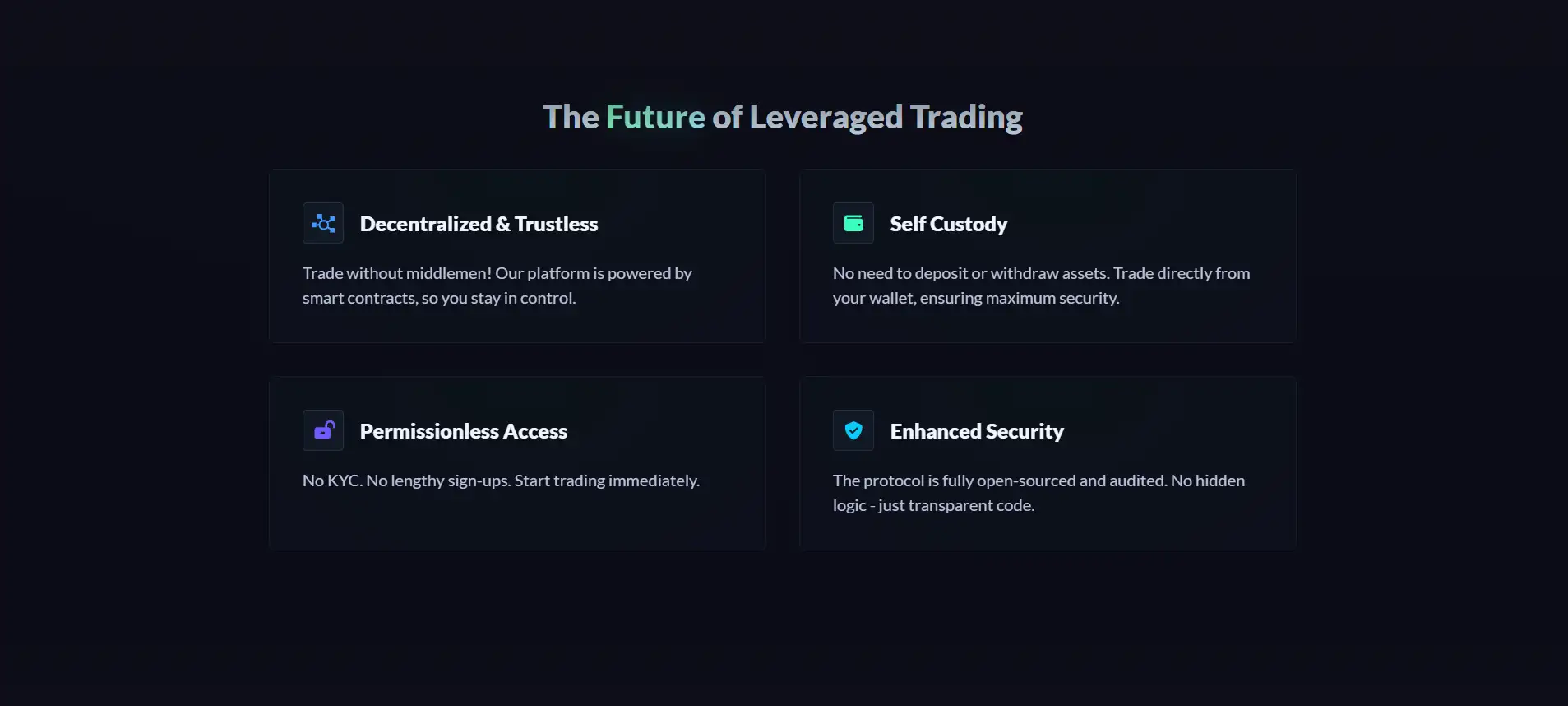 - Decentralized Leveraged Trading: Trade a variety of assets, including cryptocurrencies, forex pairs, and stocks, with up to 1000x leverage while maintaining full control over your funds via secure smart contracts.