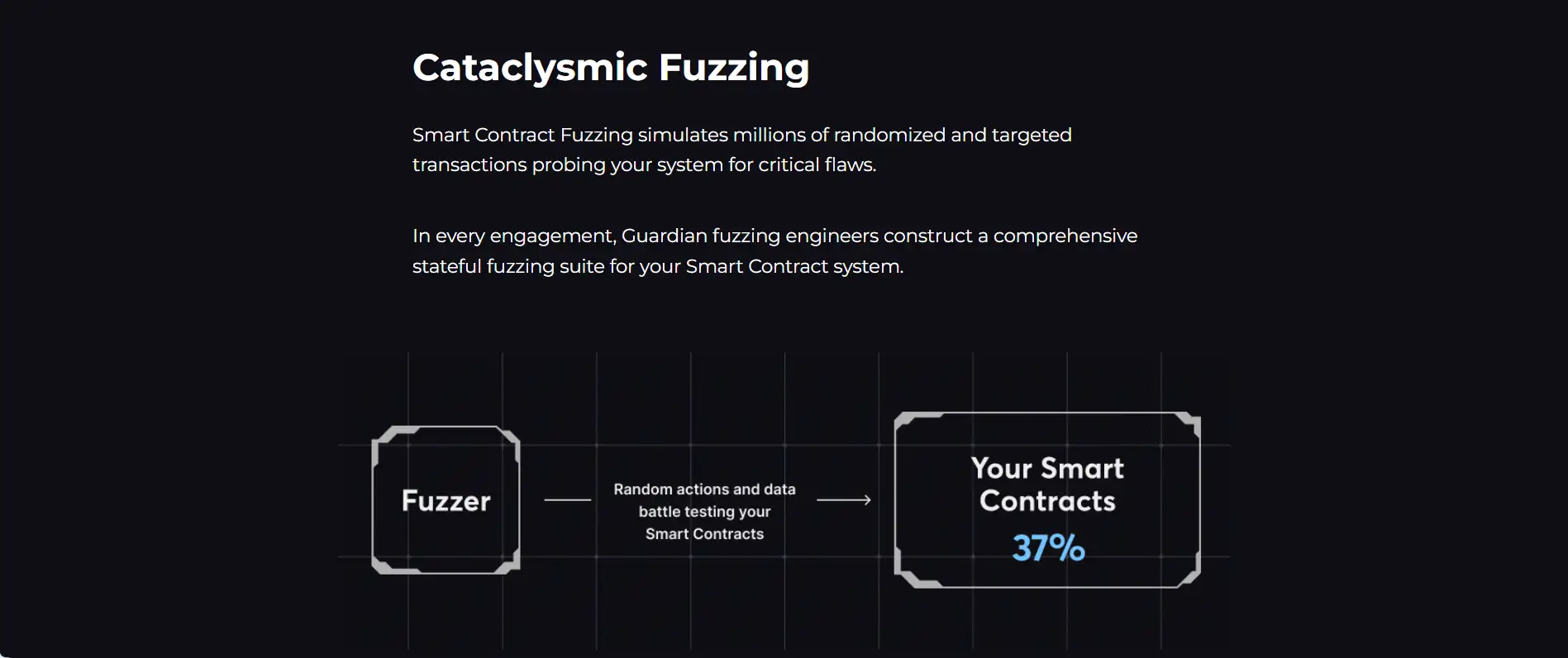 Cataclysmic Fuzzing is a key part of every Guardian engagement. After your audit ends, Guardian provides you with a custom-built fuzzing suite that continues to test your smart contract logic on an ongoing basis. This means vulnerabilities can still be caught even after launch, offering post-deployment security assurance.