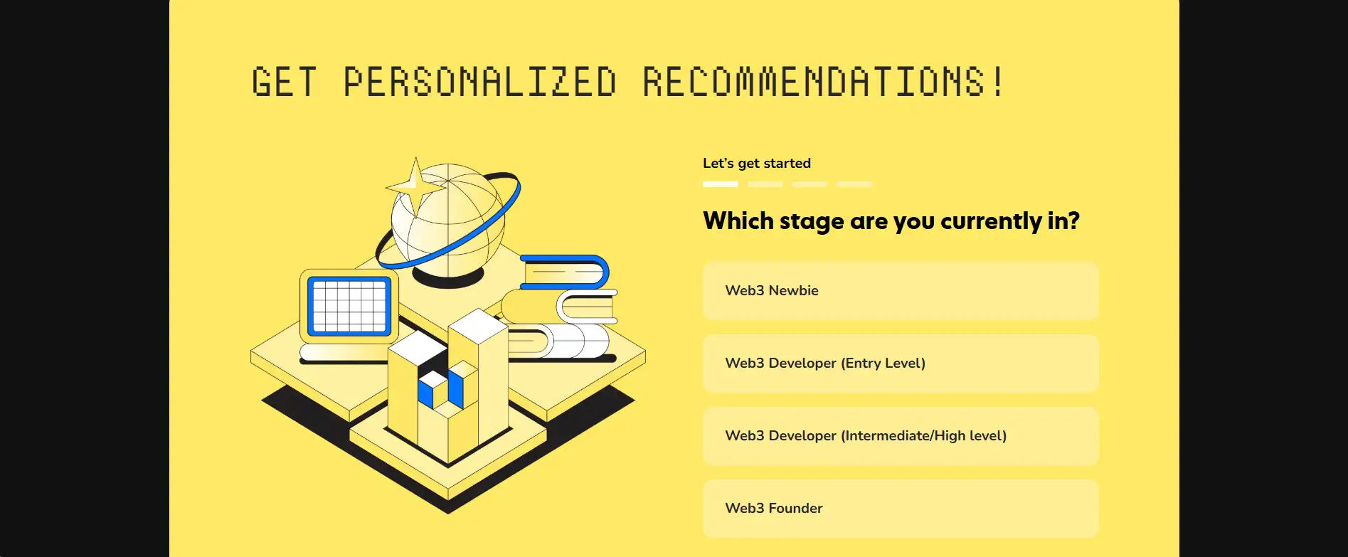 - Step 2 – Choose Your Experience Level: Select your current stage (Web3 Newbie, Entry-Level Developer, Intermediate Developer, or Founder) to get personalized course recommendations.