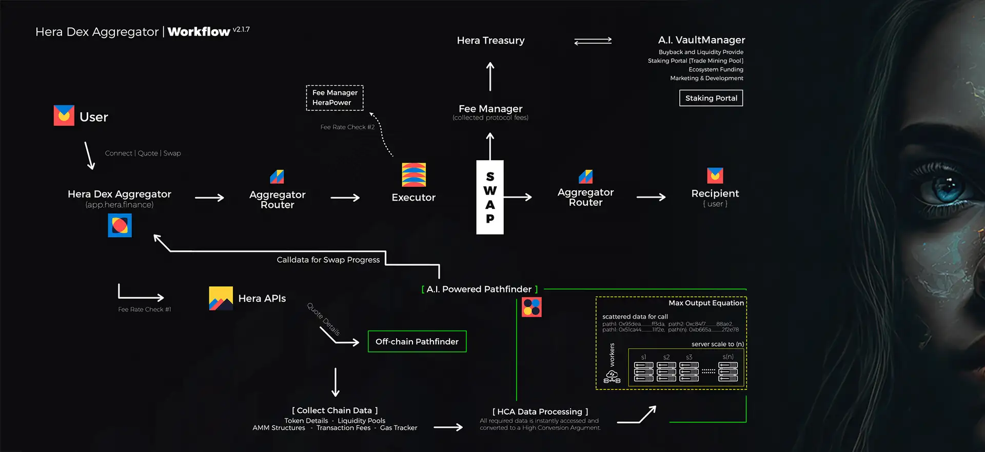 Hera Finance uses advanced AI algorithms to find the most efficient trade routes, minimizing slippage and ensuring maximum returns for users by aggregating liquidity from numerous DEXs.