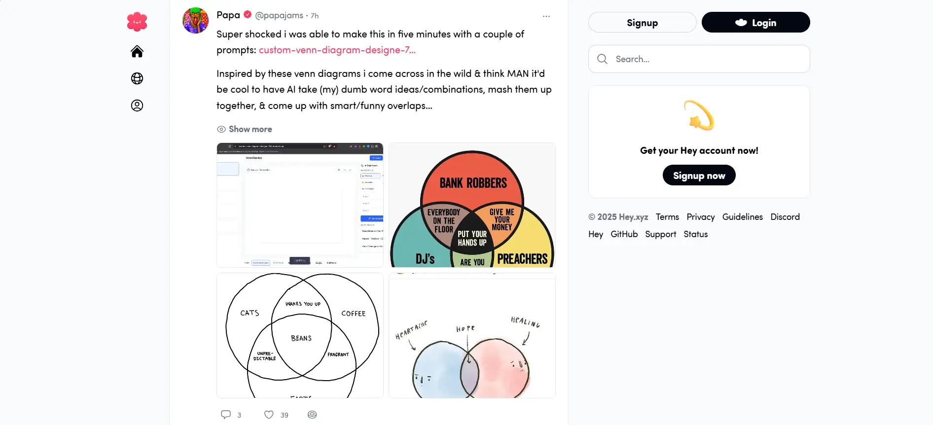 Hey is a front‑end client purpose‑built for the Lens Protocol ecosystem, giving users a clean, performant interface to post, follow, collect, and build reputation on a shared, open social graph. Because profiles and relationships live on Lens, your audience and content are not locked to a single app. This means creators who start on Hey.xyz could interact with communities across other Lens‑compatible surfaces without rebuilding their network from scratch. The app pairs this portability with familiar UX patterns—rich media posts, link previews, reposting, and real‑time indicators—so the web3 rails don’t come at the cost of usability.
