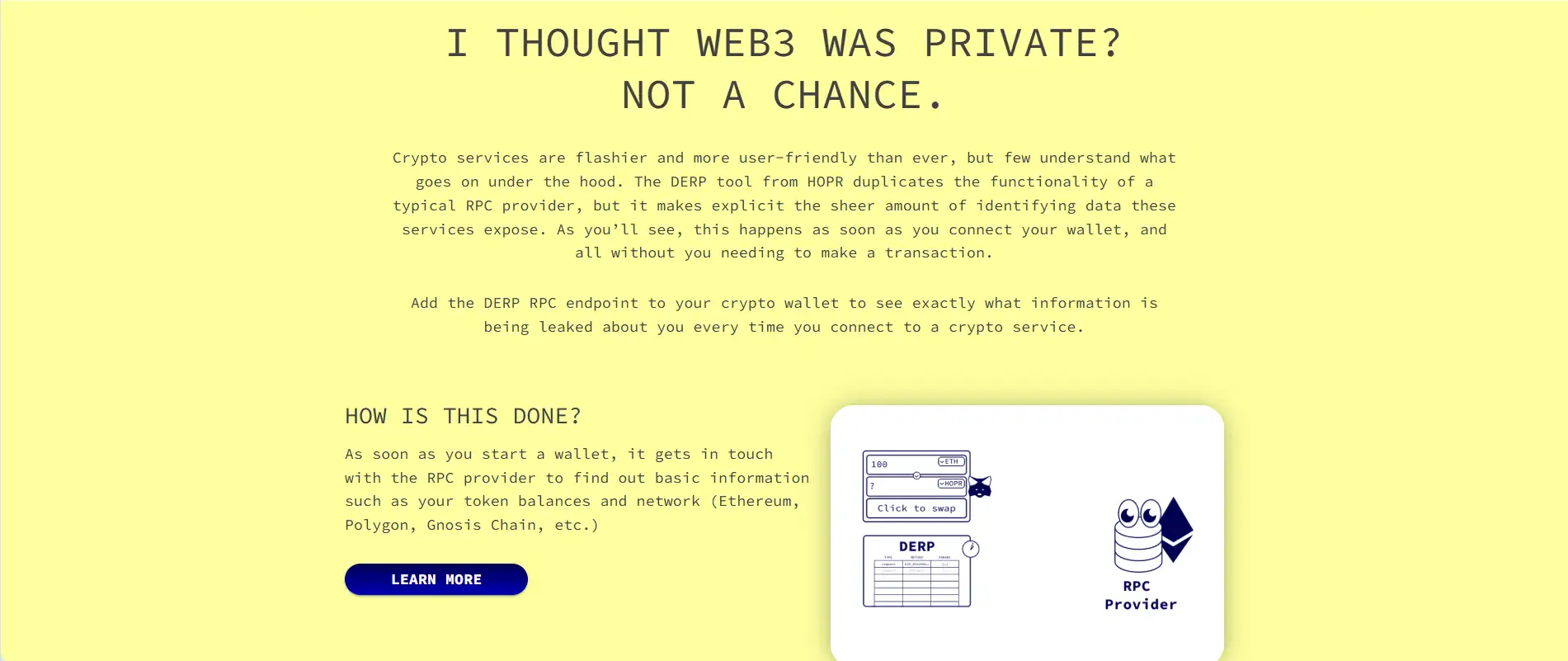 DERP, created by HOPR, is an educational RPC endpoint that mimics what traditional Ethereum RPC providers do behind the scenes. By simply connecting a wallet, users can see in real time what kind of metadata is exposed, including their IP address, wallet address, browser type, and even intended actions like NFT bids or DEX swaps. DERP doesn’t solve the problem—it reveals it, helping users understand why tools like RPCh and the HOPR mixnet are necessary.