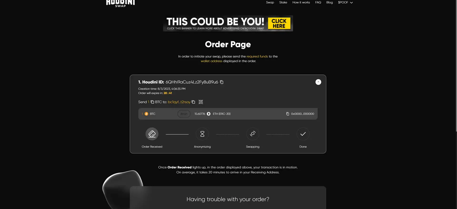 - Track Your Swap: After initiating the swap, you can monitor the progress directly on the platform. Houdini Swap will notify you once the transaction is complete.