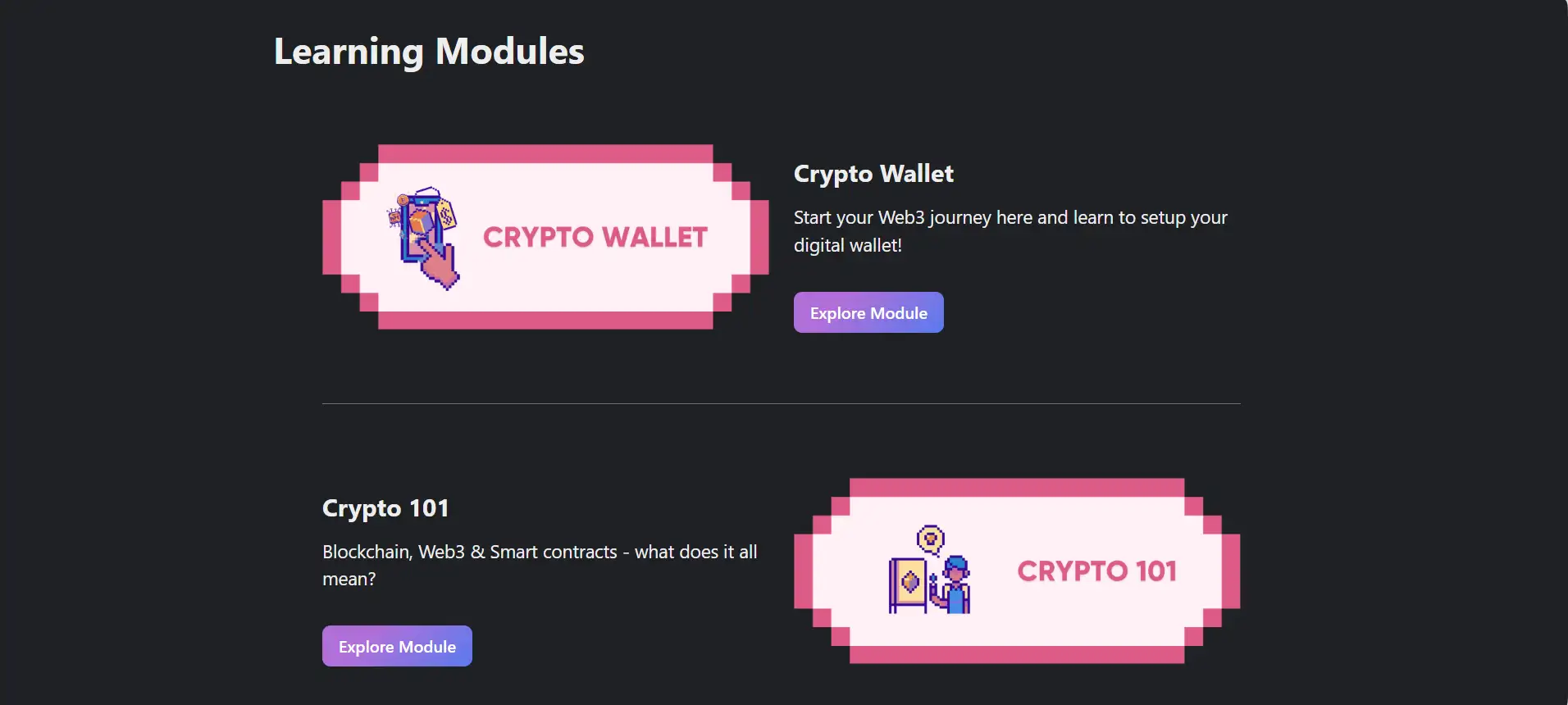 - Select a Learning Module: Start with modules like Crypto Wallet or Crypto 101 for foundational knowledge.