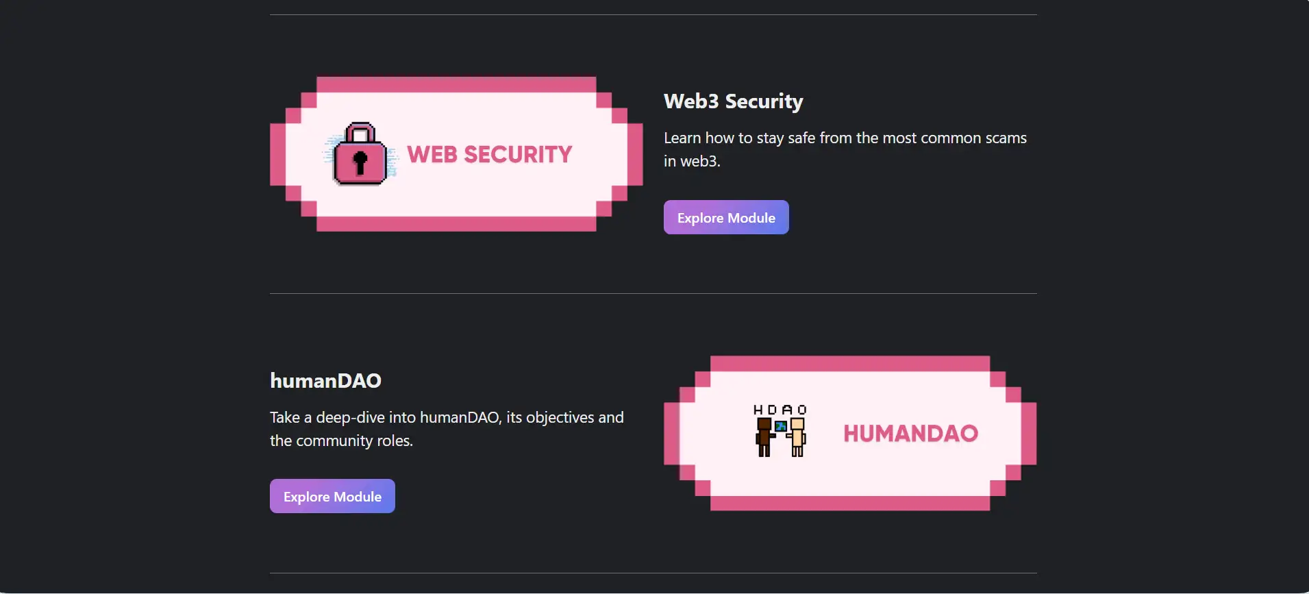 After completing the module on humanDAO, learners gain an understanding of how the DAO operates, what its values are, and what kinds of roles exist within the community. This creates a clear on-ramp for users to go from student to contributor. Many learners end up participating in DAO governance, community roles, or project collaborations. Learn more at academy.humandao.org.