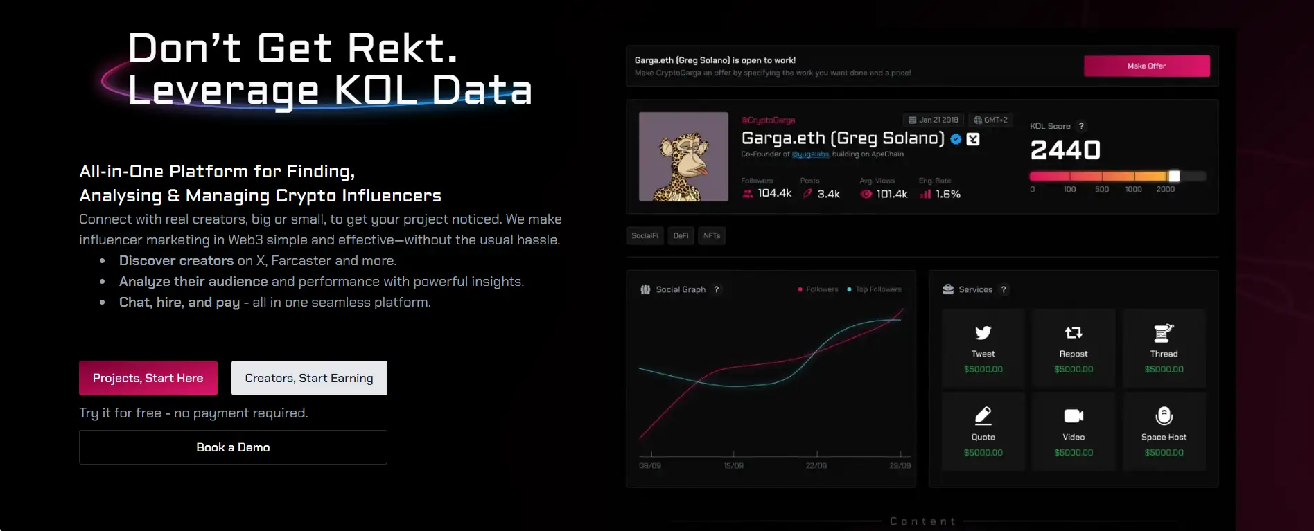 - Web3-Native KOL Discovery: Find influencers across X, Farcaster, and other Web3 social platforms with verified audience data.