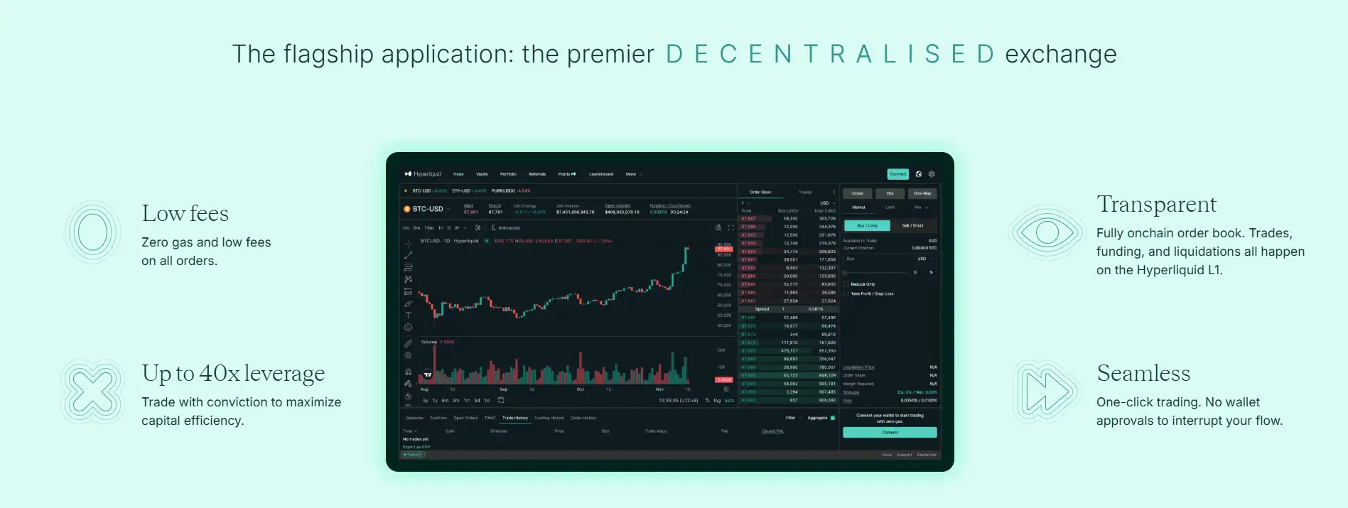 - Fully Onchain Order Book: Every order, trade, liquidation, and funding payment is executed transparently onchain with one-block finality via HyperBFT.